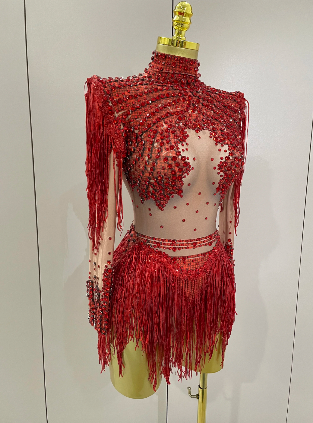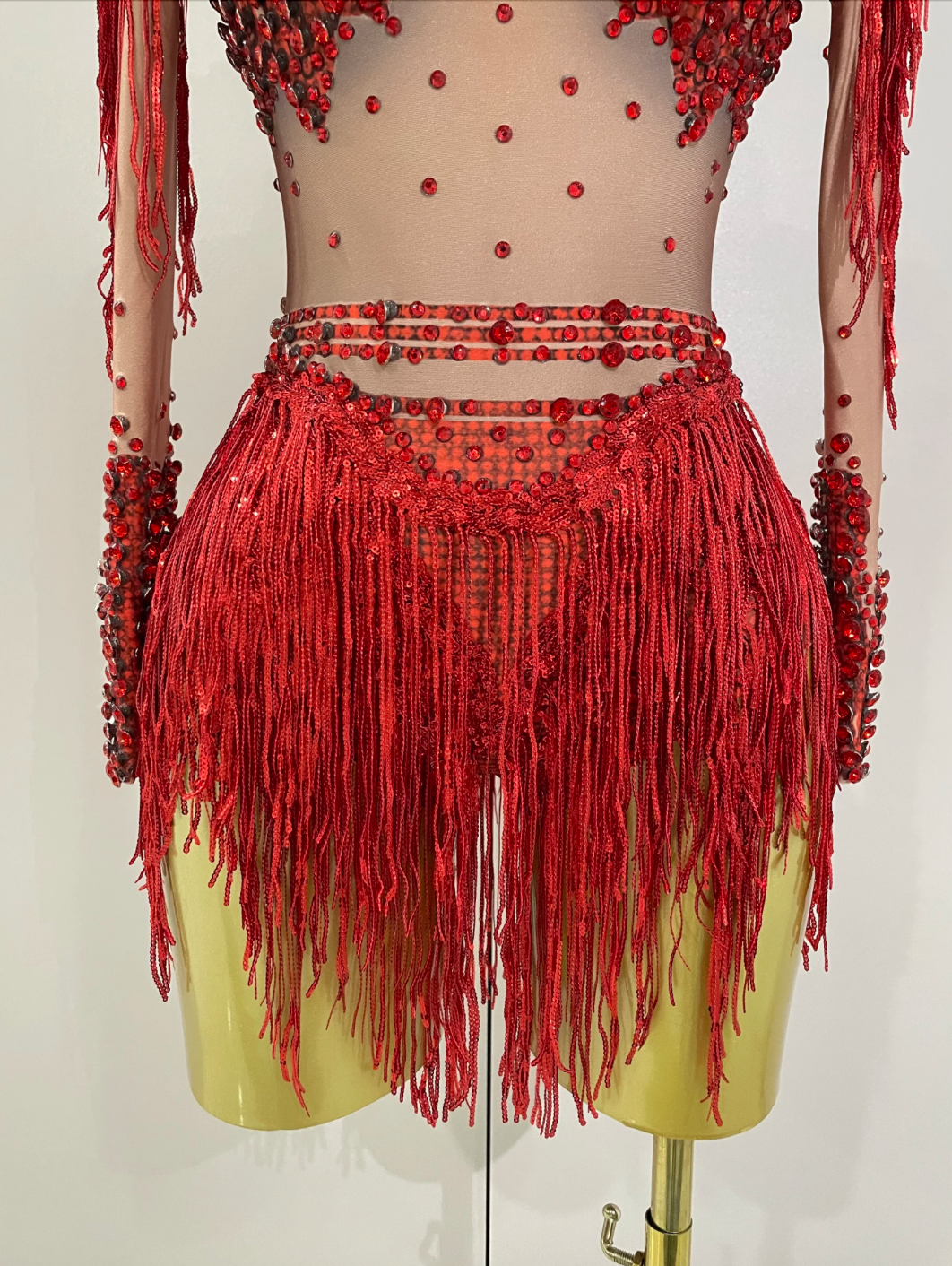 Ready to Ship Dance Performance Costume Bodysuit with fringe skirt headdress optional.