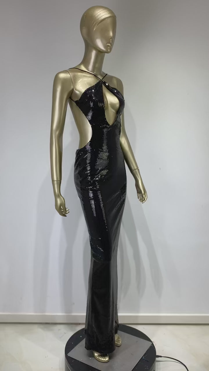 Women Dress Luxury Sexy Backless Halter Black Mesh Sequin Maxi Long Gowns Dress Elegant Sparkly Evening Party Club Dress