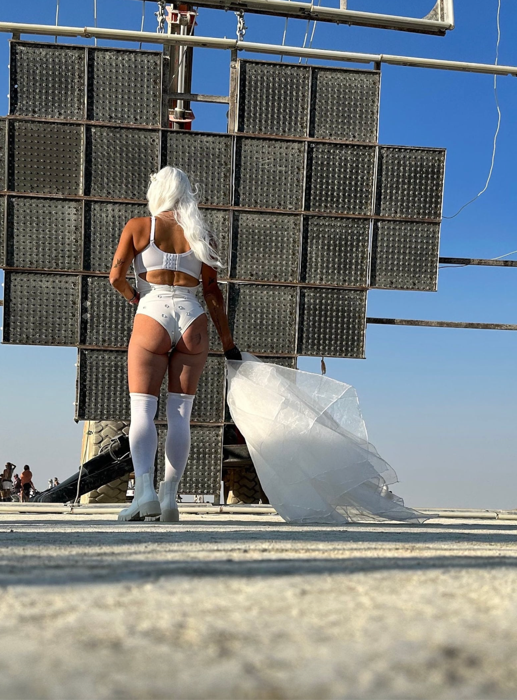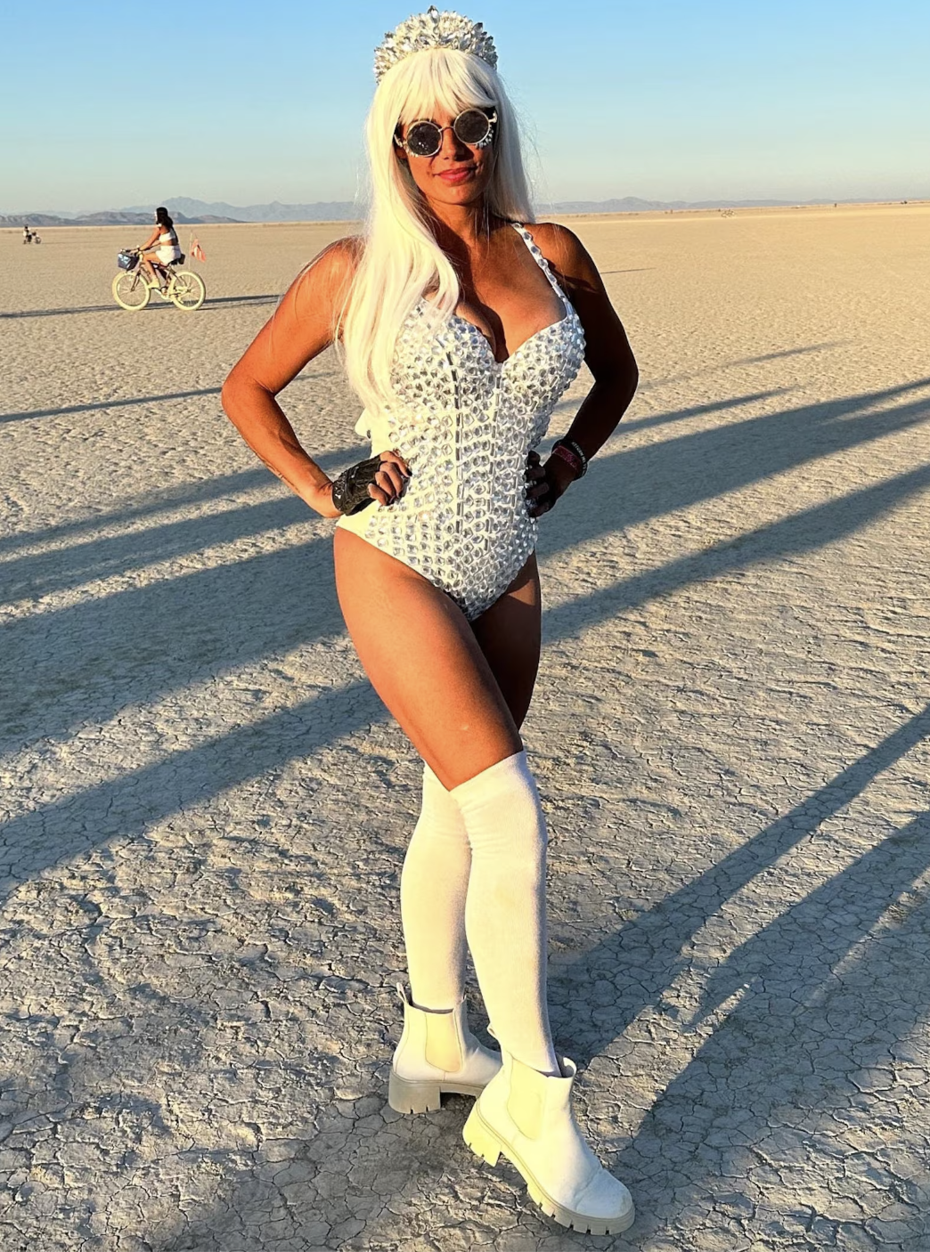 Burning Man Bride Bodysuit: Inspired Crystal Rhinestones Style & Vegas stage performance costume Nude & Silver Short see through sleeves tassel covered with silver stars & pearls Size: