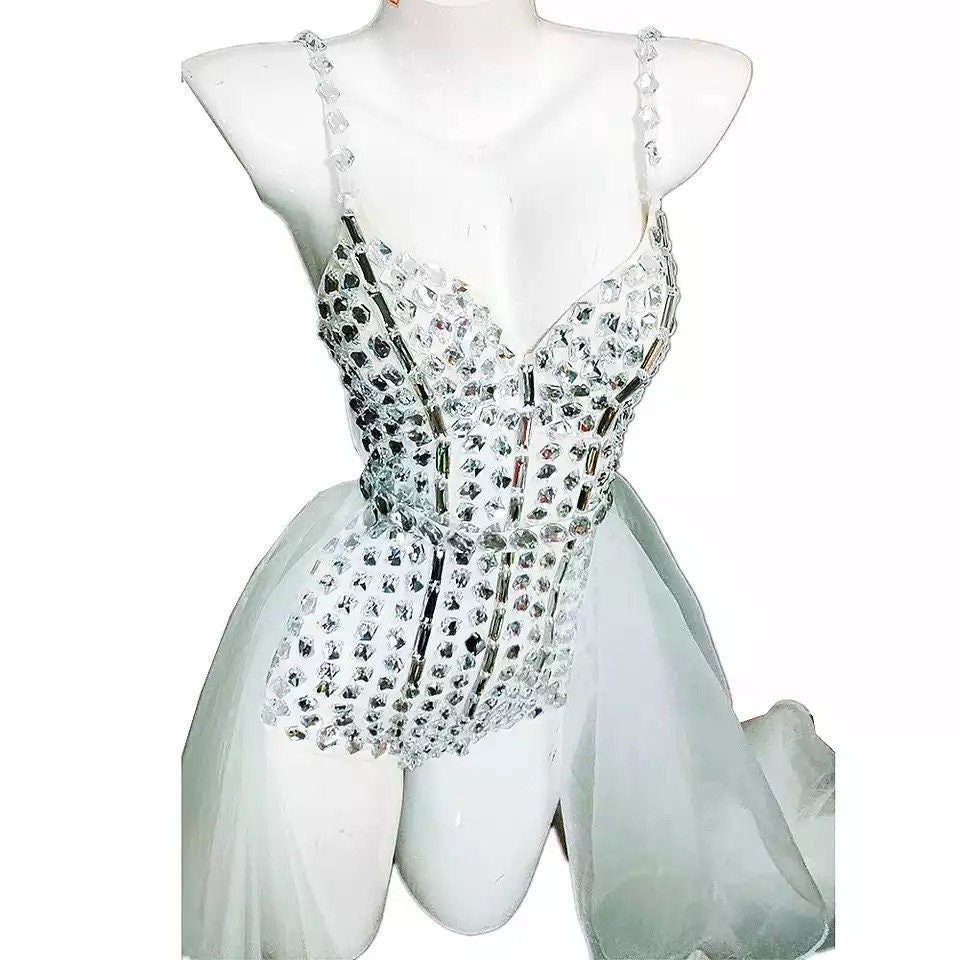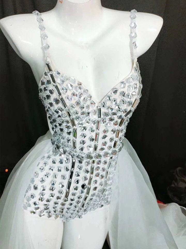Rhinestone Bodysuit Crystal Diamond Jumpsuit Sparkling Sequin Birthday Dress Bachelorette Bride Tutu Skirt Gown Space Costume