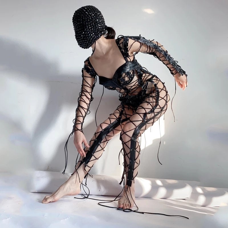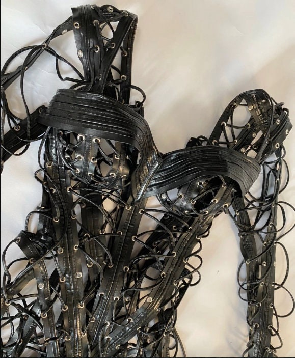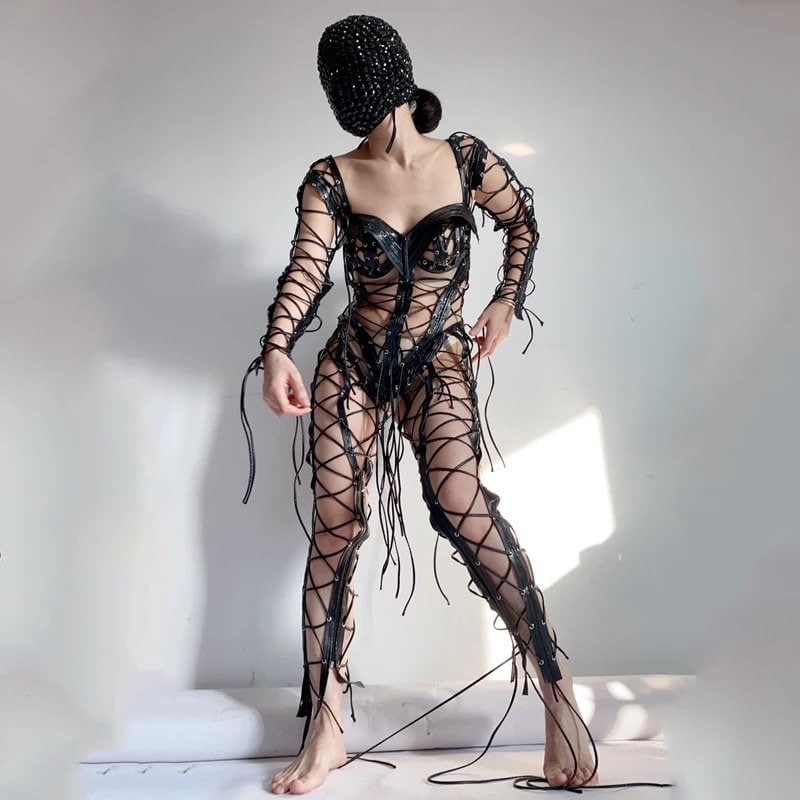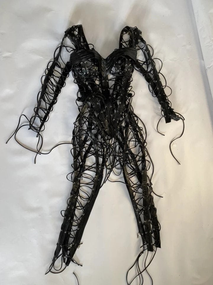 Rhinestone Jumpsuit Fetish PVC BDSM Costume Space Futuristic Faux Leather Harness Fringe Rave Unisex BurningMan Halloween DragQueen Gothic