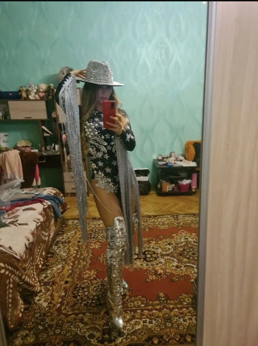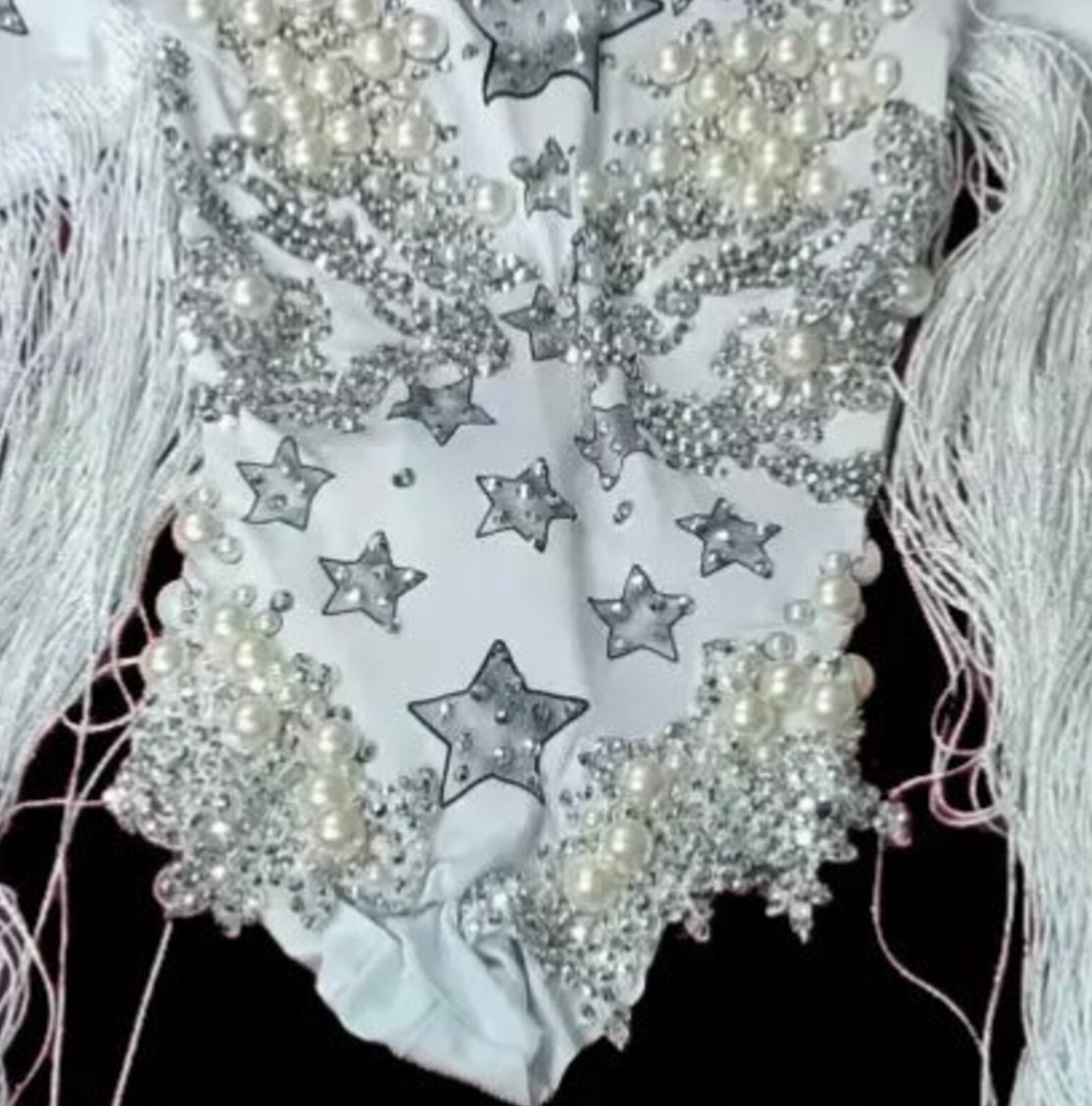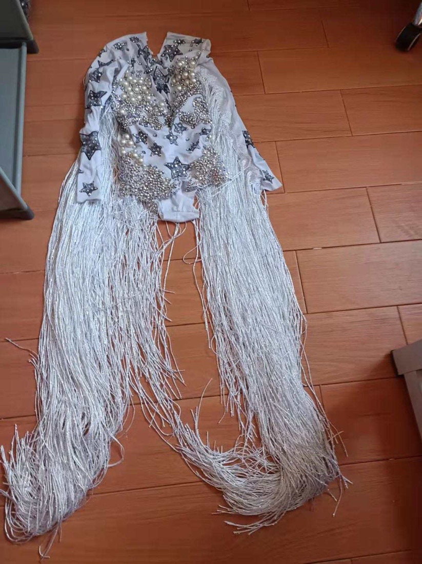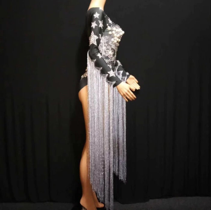 Black Party dress Rhinestone Bodysuit with tassel fringe cowgirl Stage Performance Bodysuit Dress long sleeves Tassel Cowgirl Costume Rhinestone Stars Pearls Crystal Silver & Black.