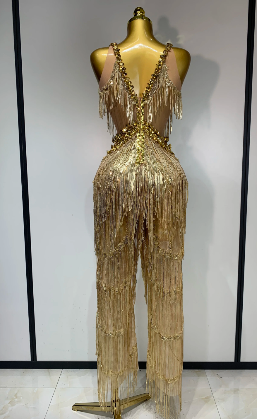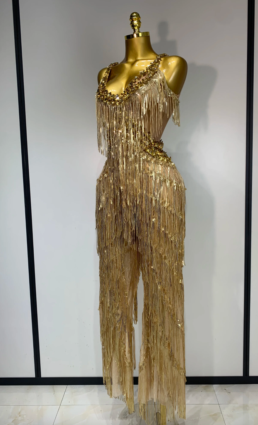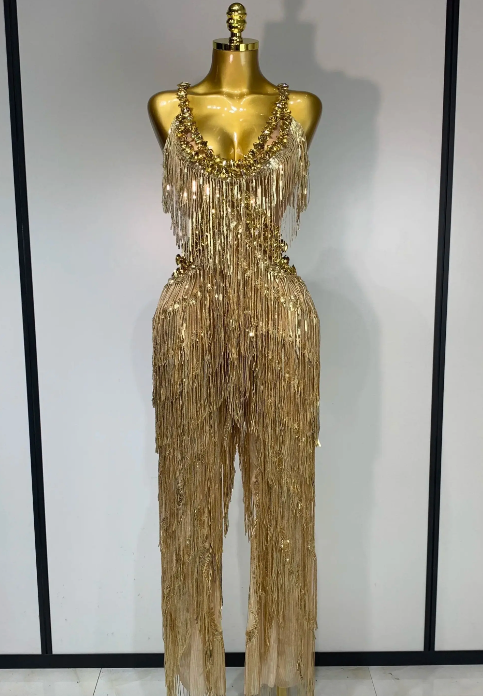 Fringe Jumpsuit for Women Gold tassel performance clothing for women bodysuit NEW IN