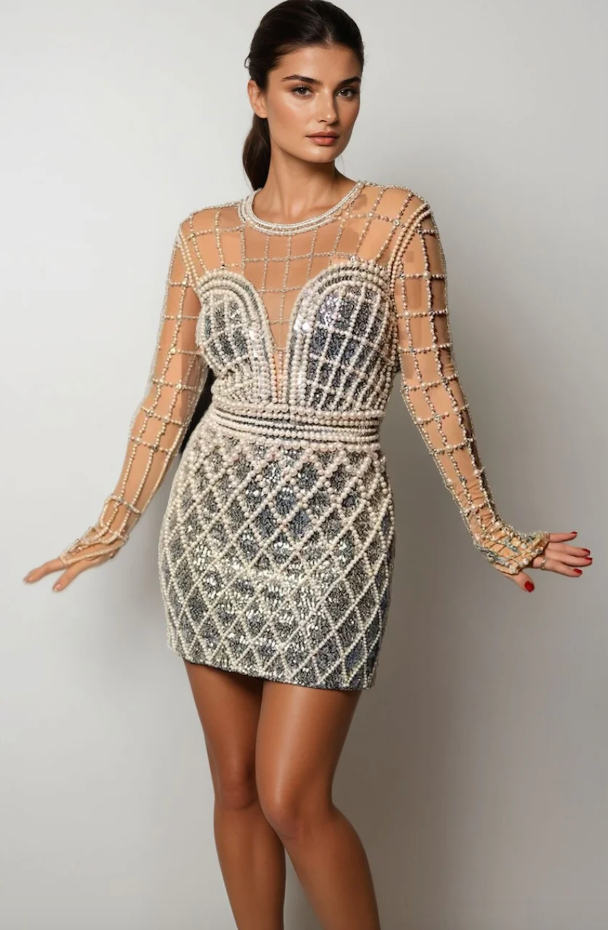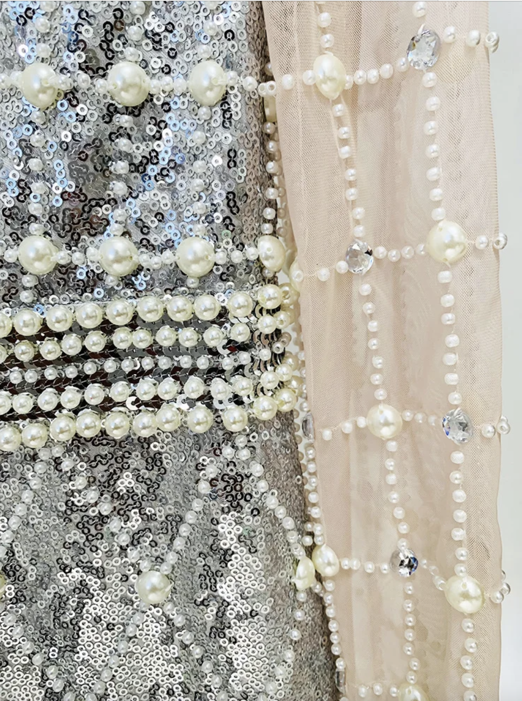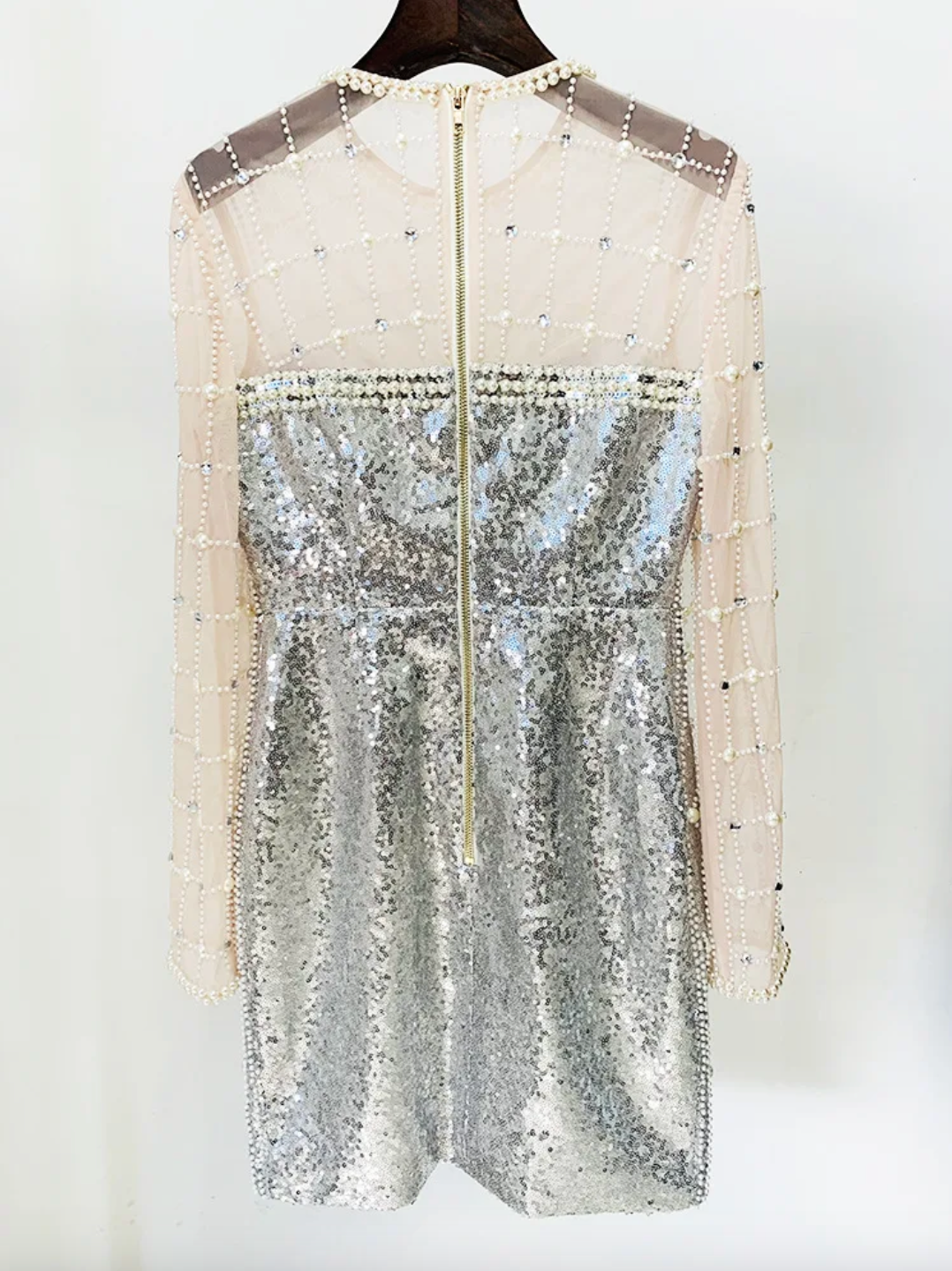 HIGH STREET Newest 2025 Designer Fashion Women's Stunning Diamonds Pearls Beaded Sequined Long Sleeved Gauze Dress