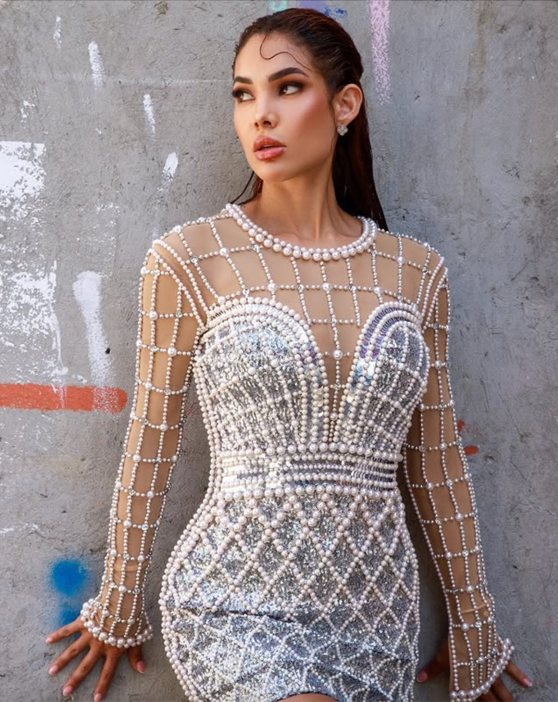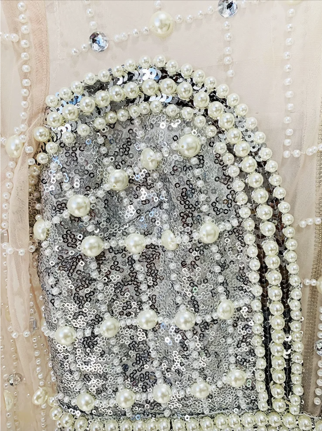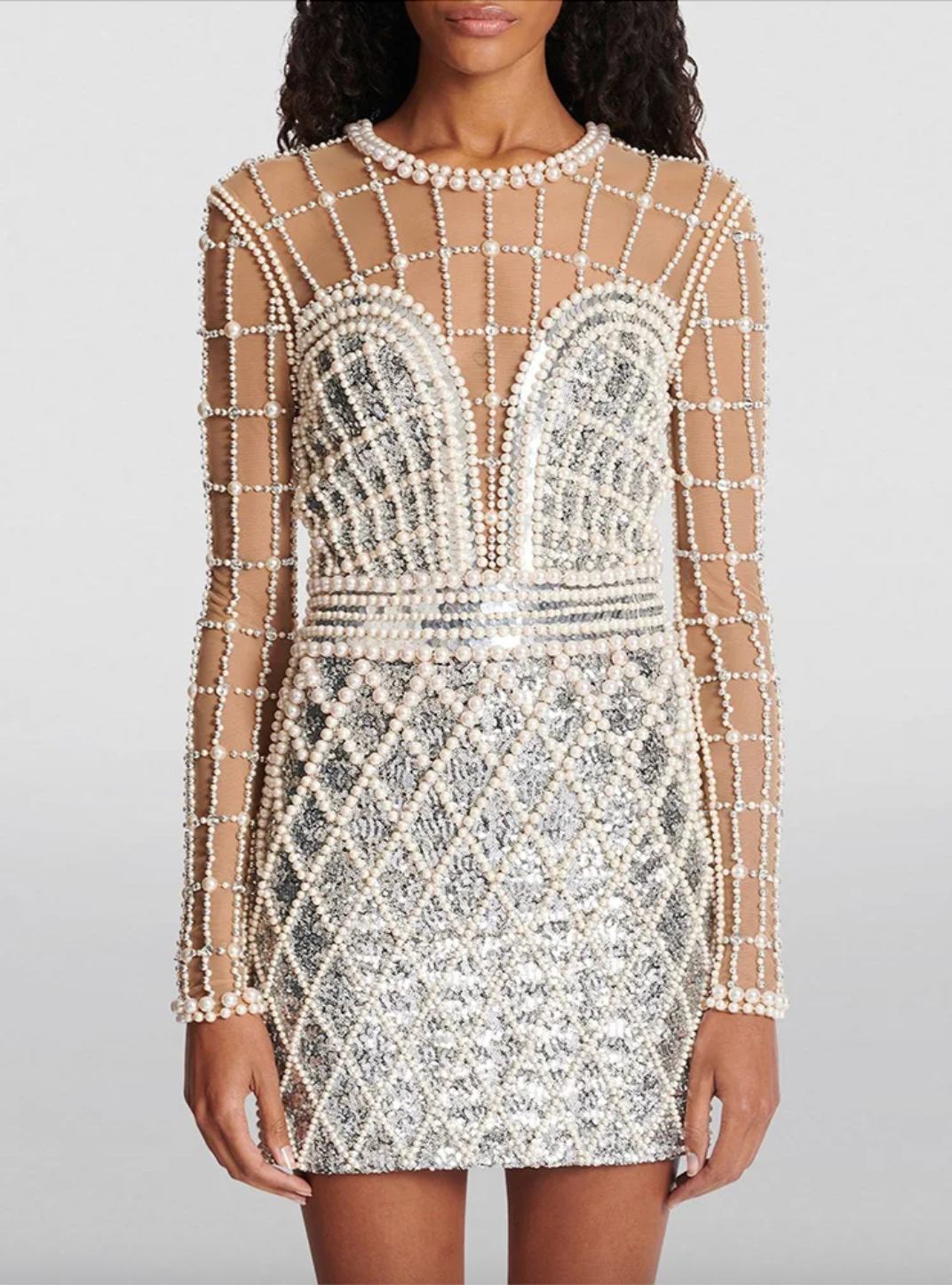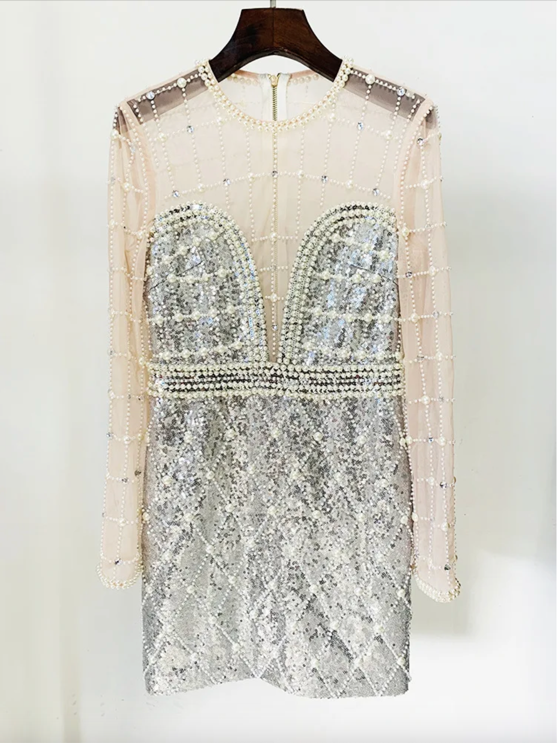 HIGH STREET Newest 2025 Designer Fashion Women's Stunning Diamonds Pearls Beaded Sequined Long Sleeved Gauze Dress
