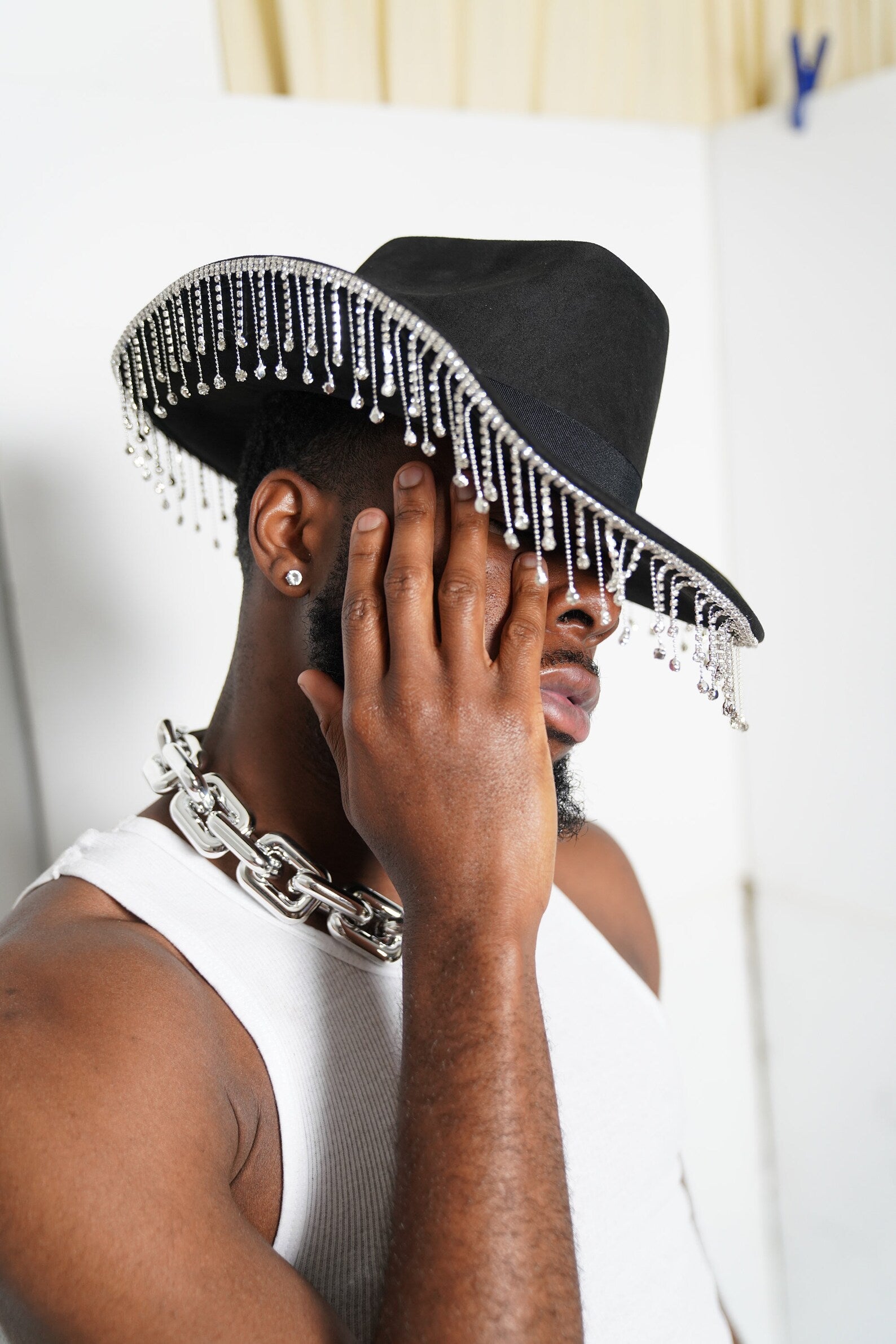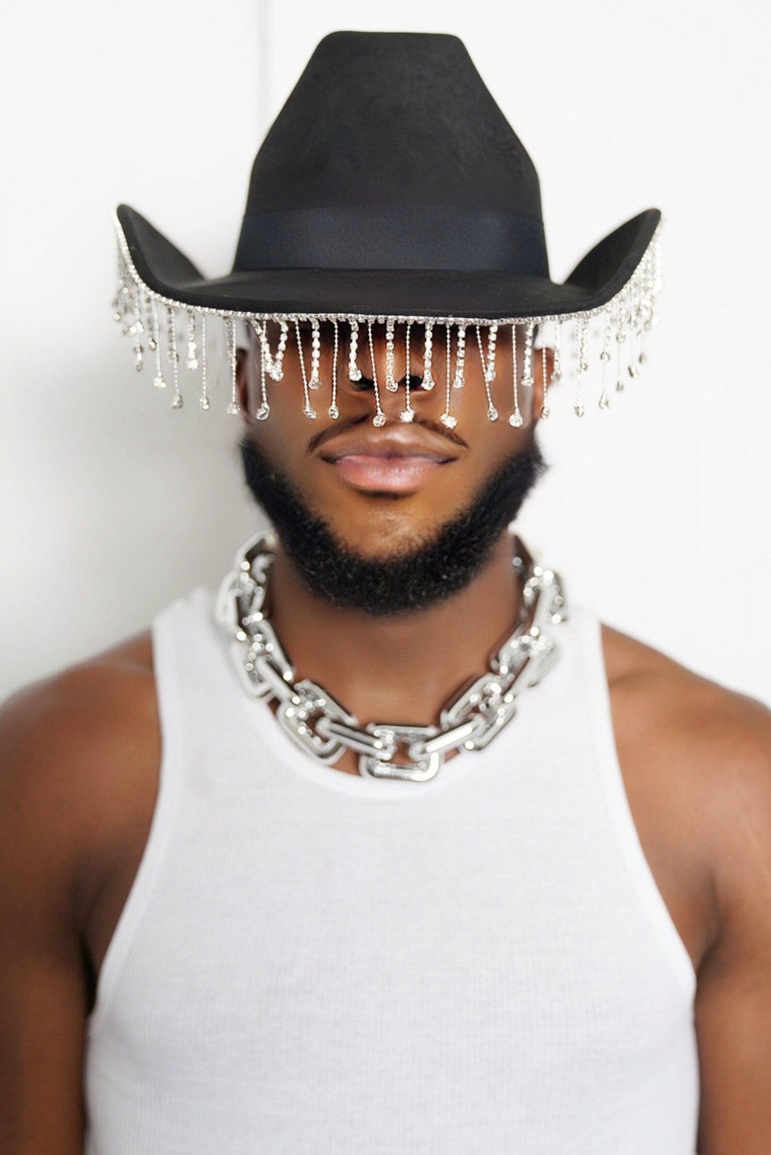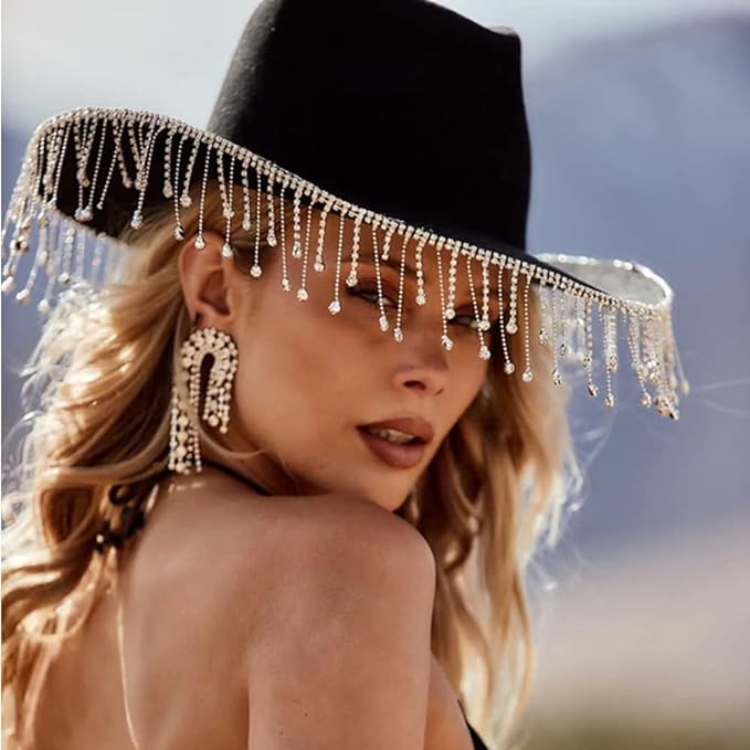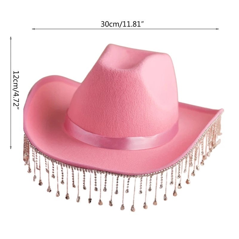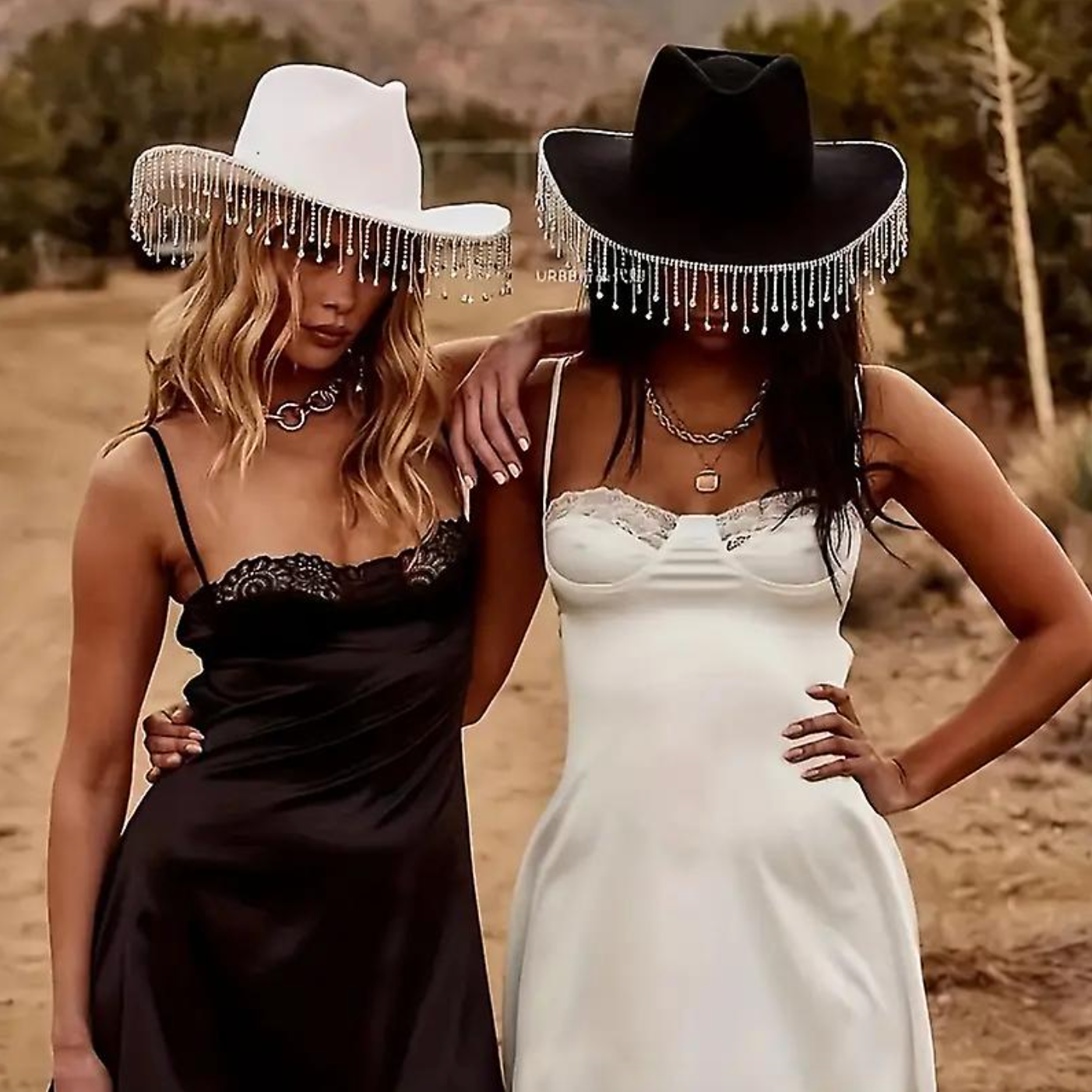 Cowgirl Hat and Cowboy Hat with rhinestone fringe ready to ship free delivery. Available in White, Pink and Black.