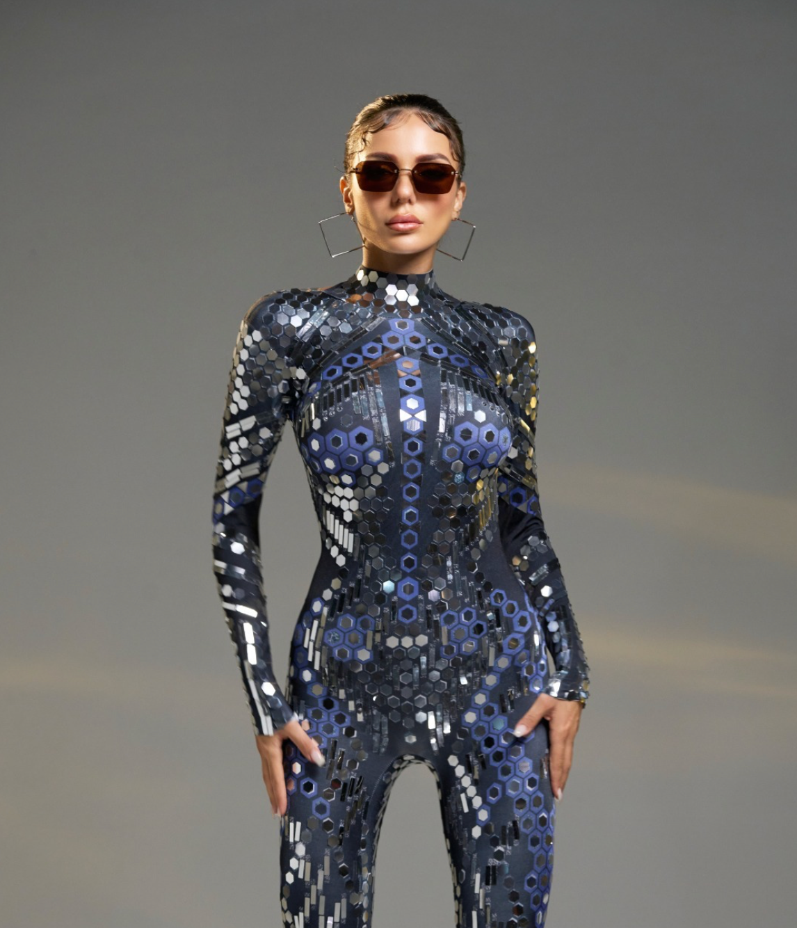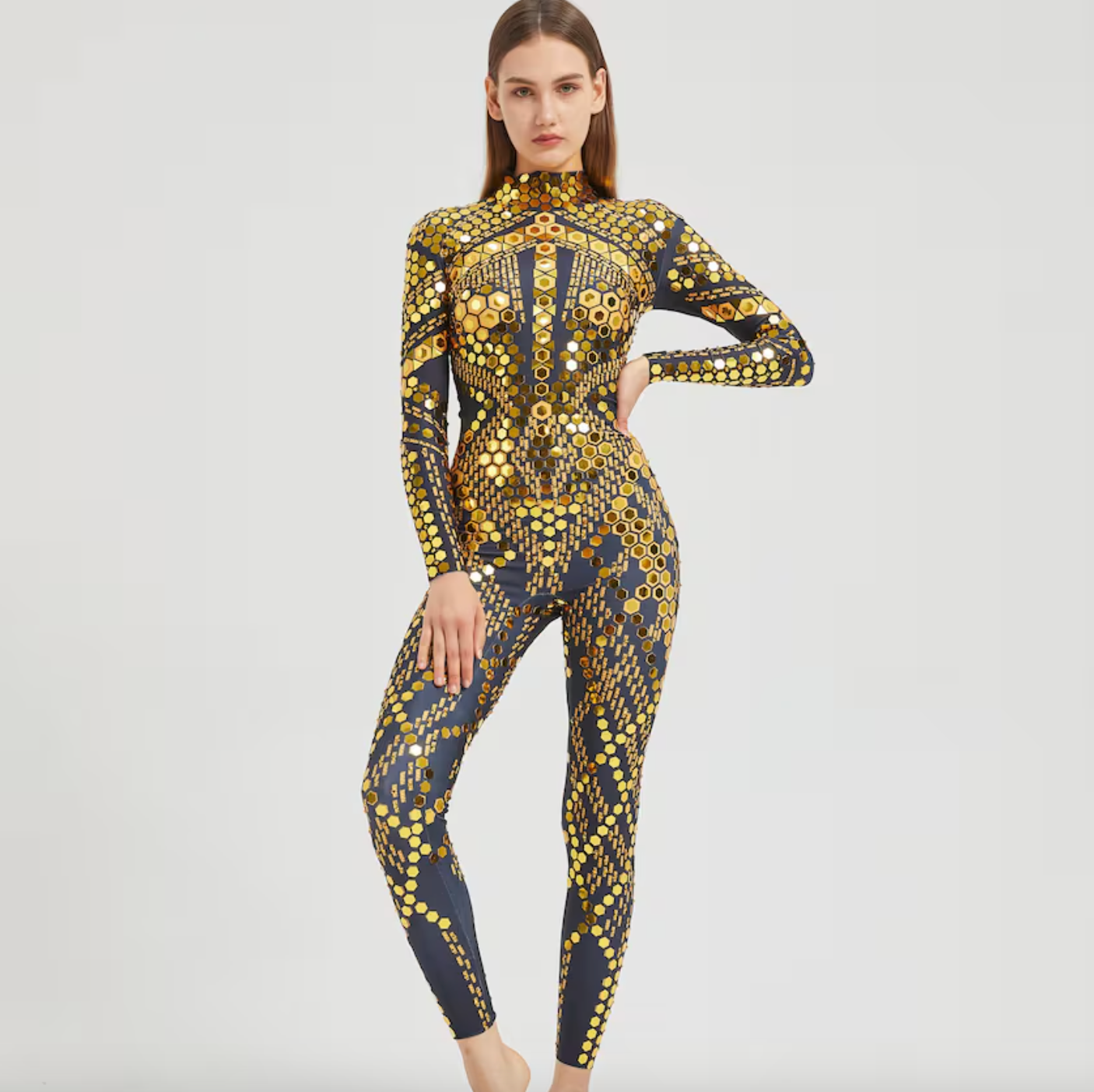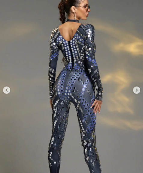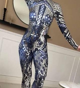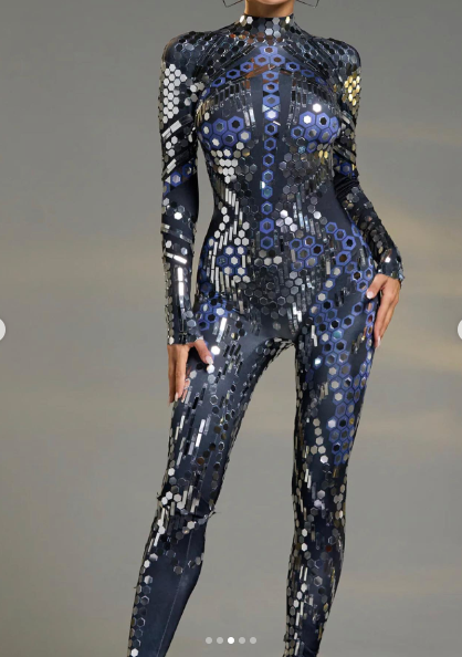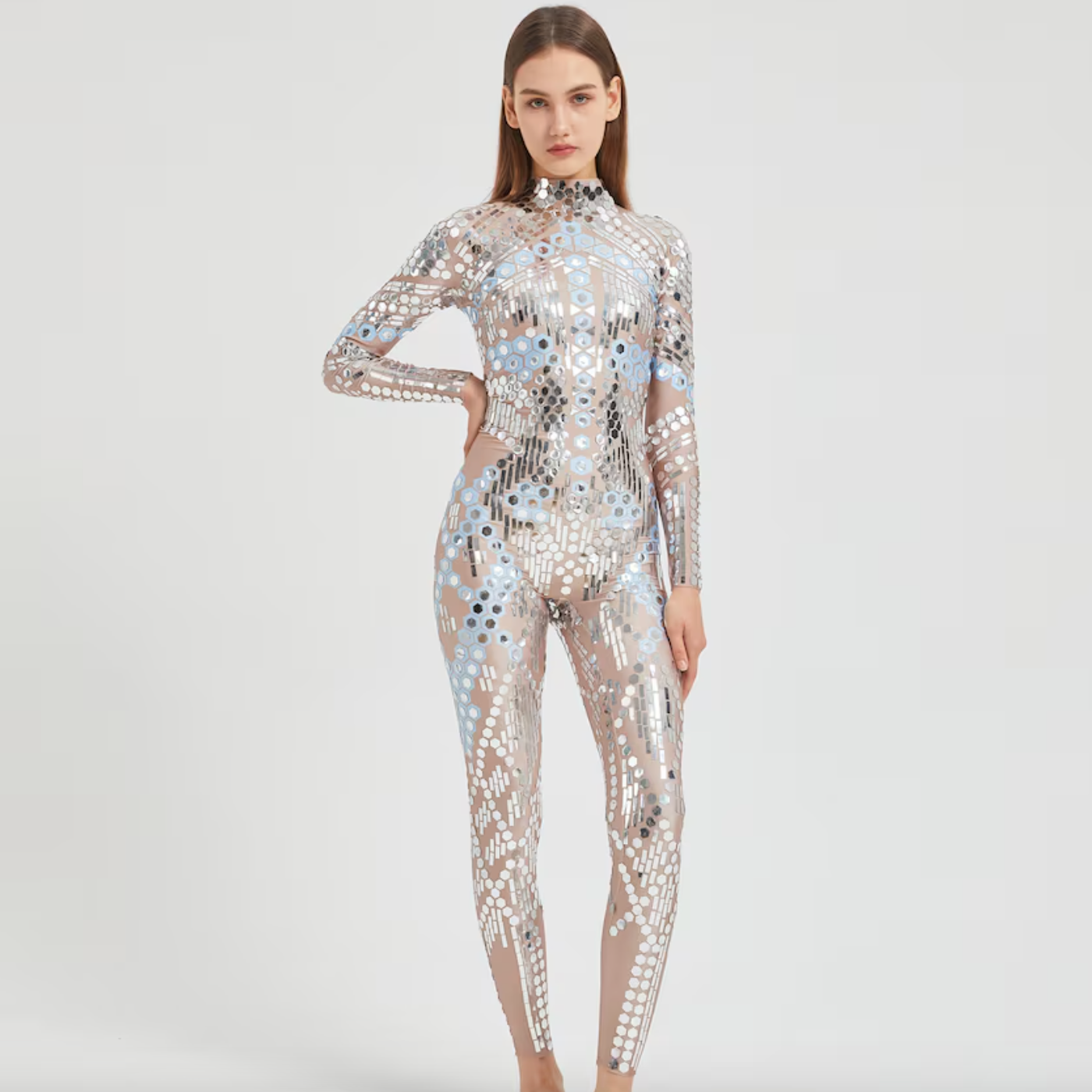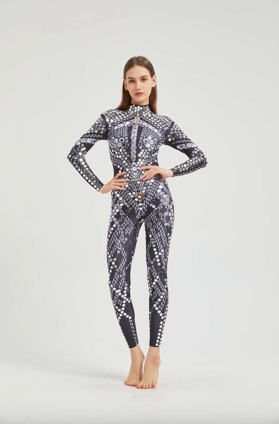 Festival Mirror Jumpsuit Party Costume Black Catsuit party outfit. Bodysuit