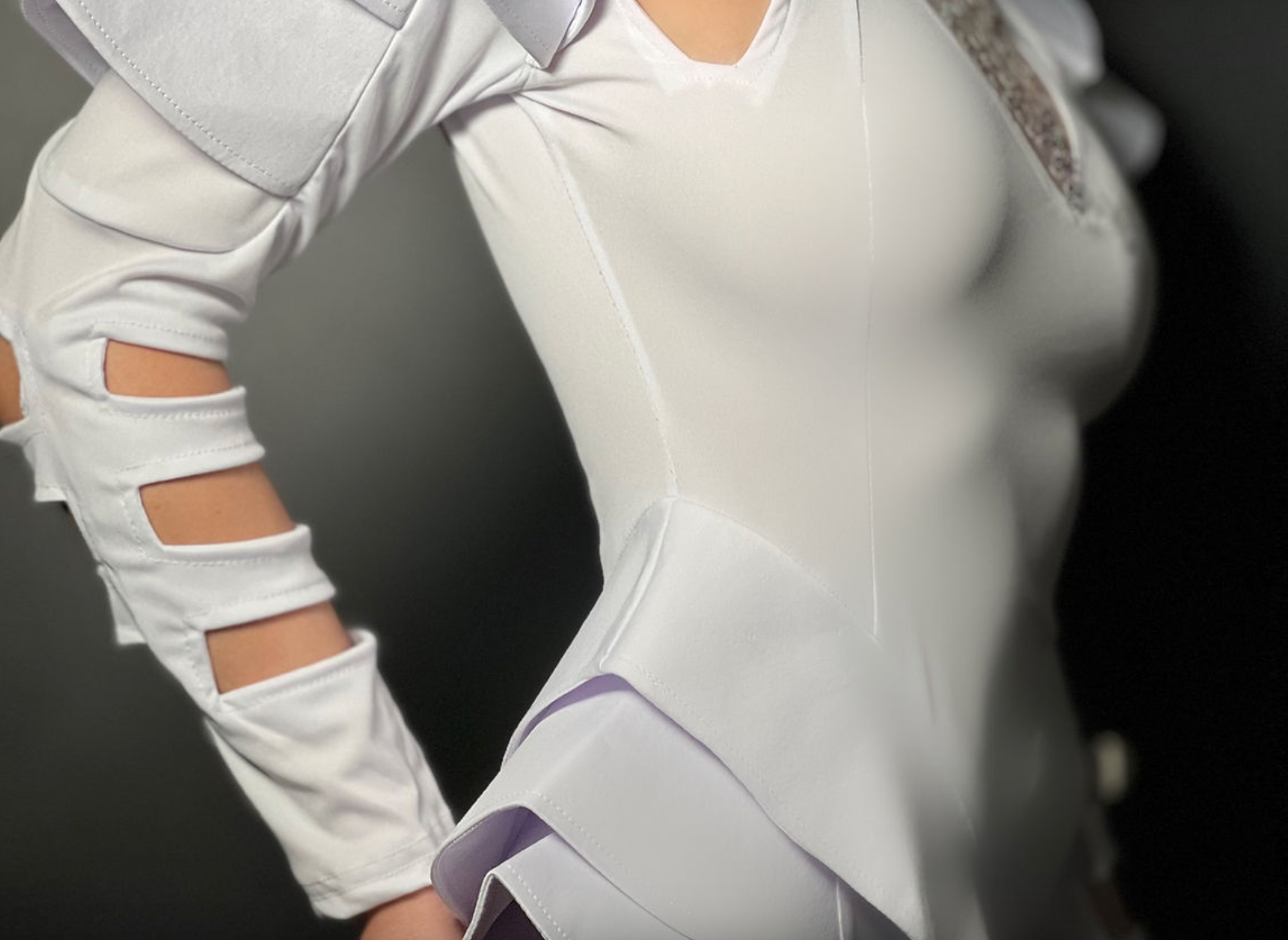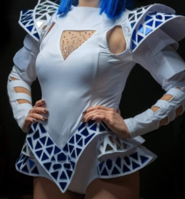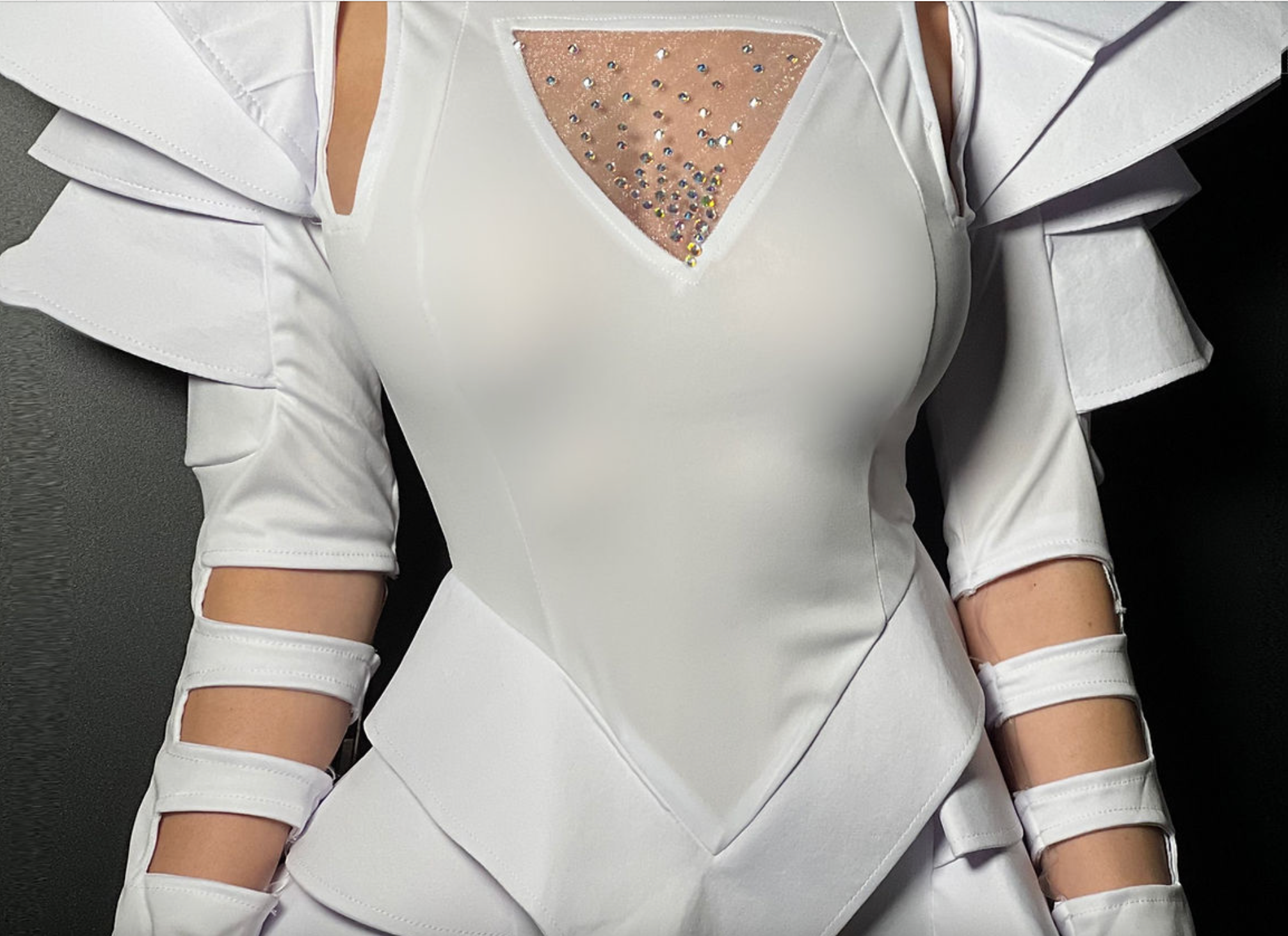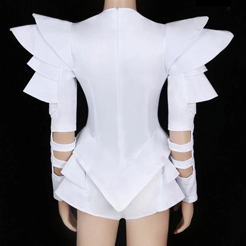 Looking for a Party Themed Costume or Outfit for Festival, Burning Man, Birthday Dress Futuristic Robot Costume White Metallic Effect Bodysuit, Stage Performance Bodysuit Dress long sleeves Tassel Cowgirl Costume Rhinestone Stars Pearls Crystal Silver & Black Drag Queen Clubwear Bodysuit Jumpsuit with Fringe. inspired Lady Gaga Costume. Fancy Halloween costume.