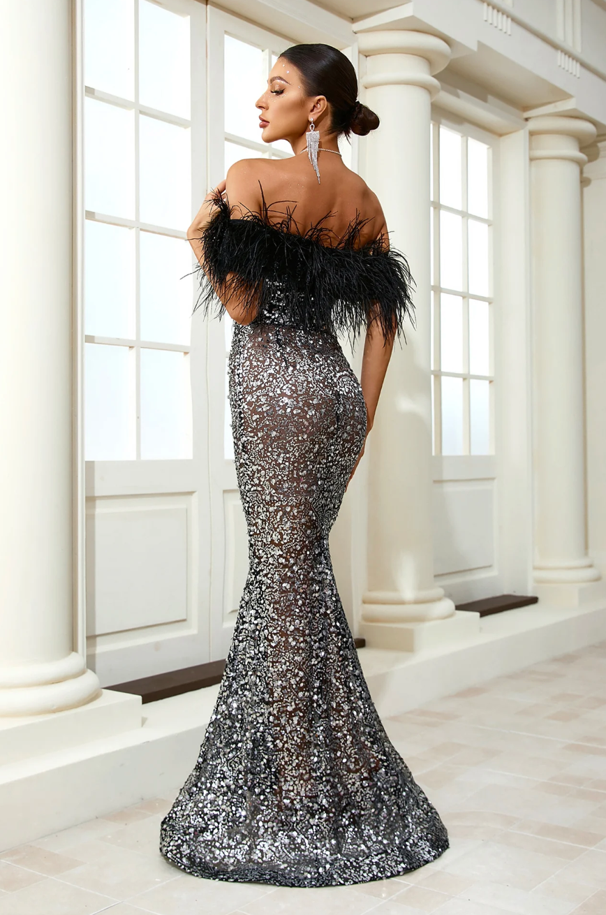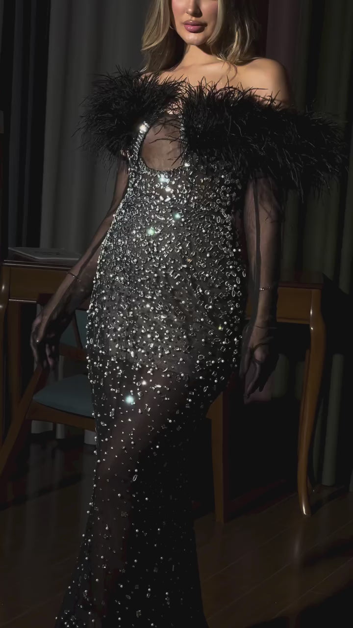 Luxury Feather Dazzling Diamonds Sexy Mesh See Through Black Floor Length Dress Goddess Evening Party Dress Red Carpet Vestido