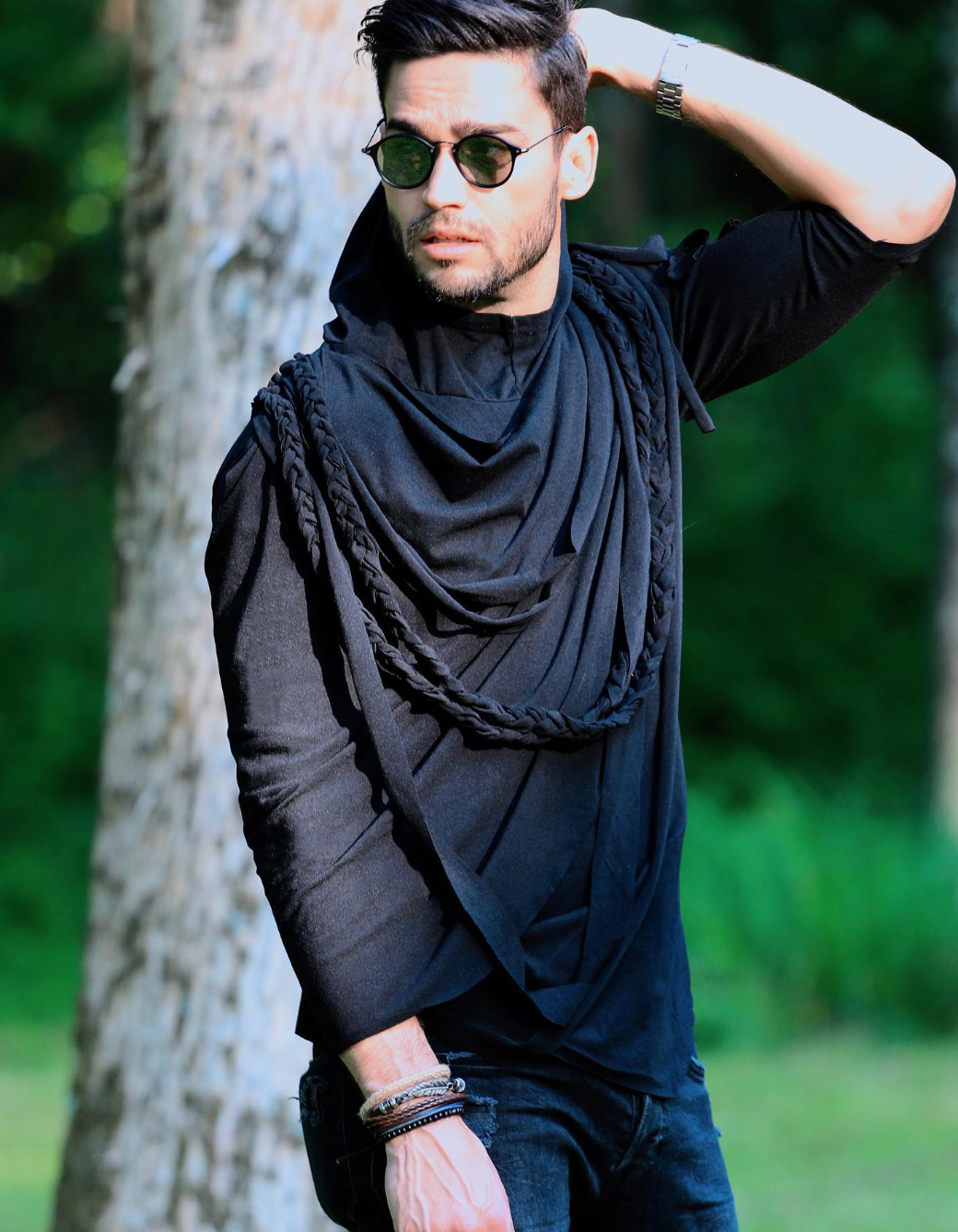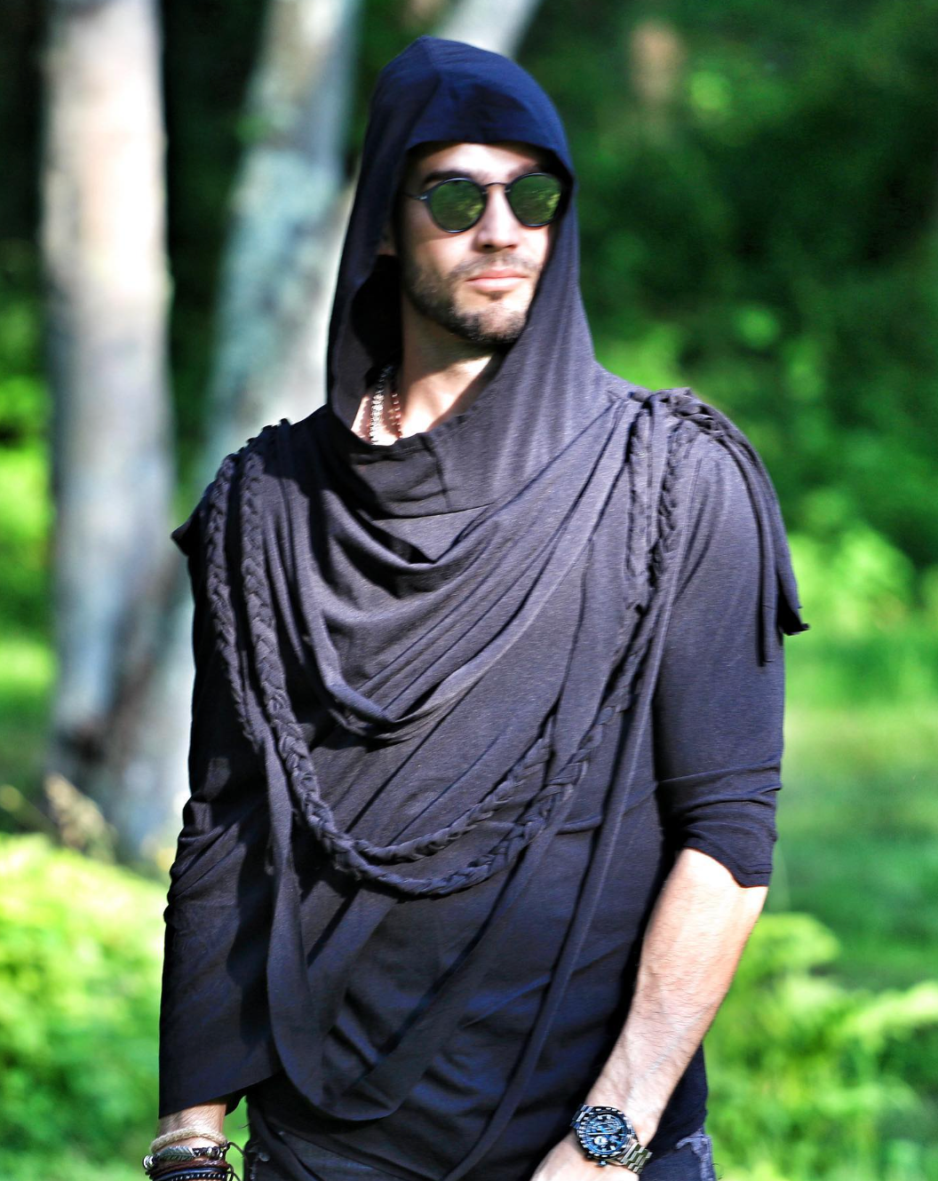 Men Festival Outfit Hooded Black Scarf Hoodie Gothic Cardigan Maxi Boho Scarf Burning Man Rave Men Outfit Rock Festival Clothing For Men