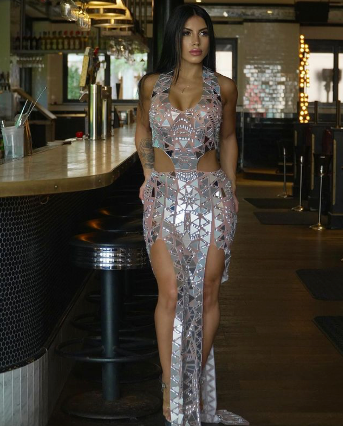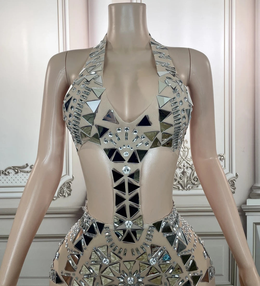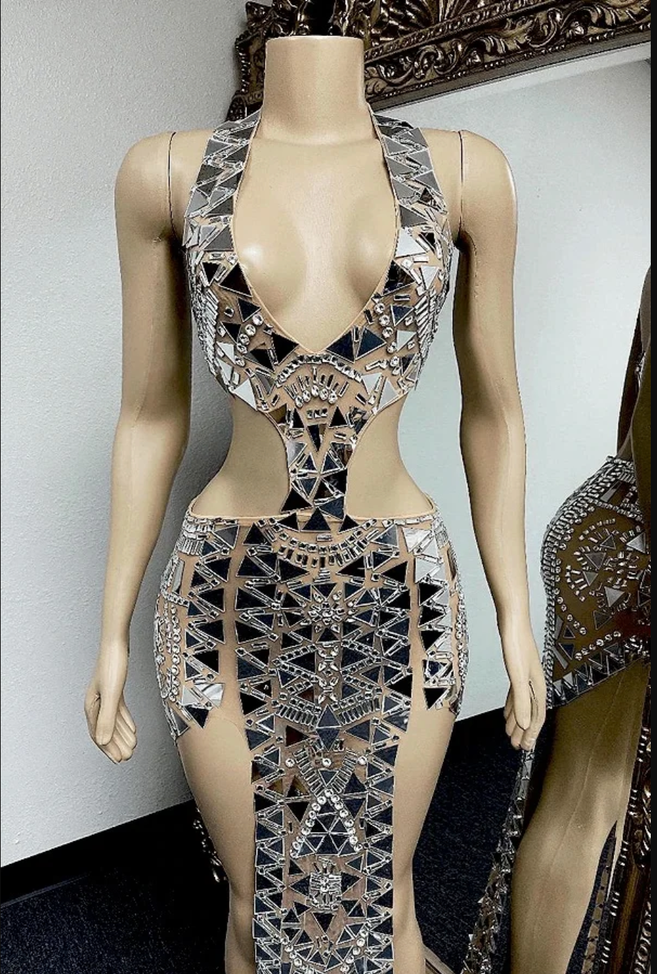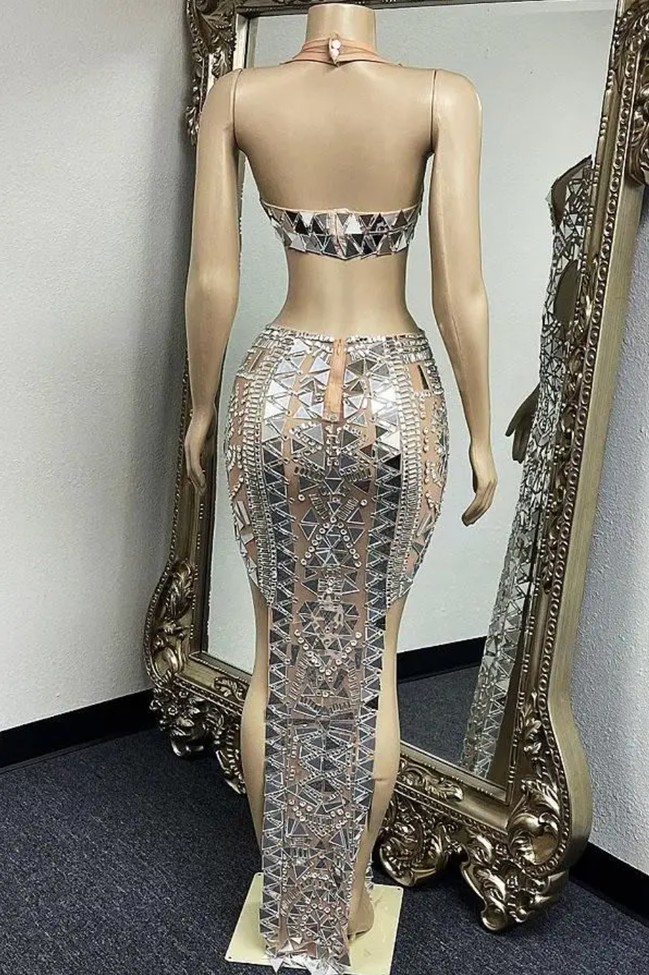 Party Dress Long Split Maxi Mirror Dress Sparkle Maxi Gown Diamond Dress Festival Dance Costume