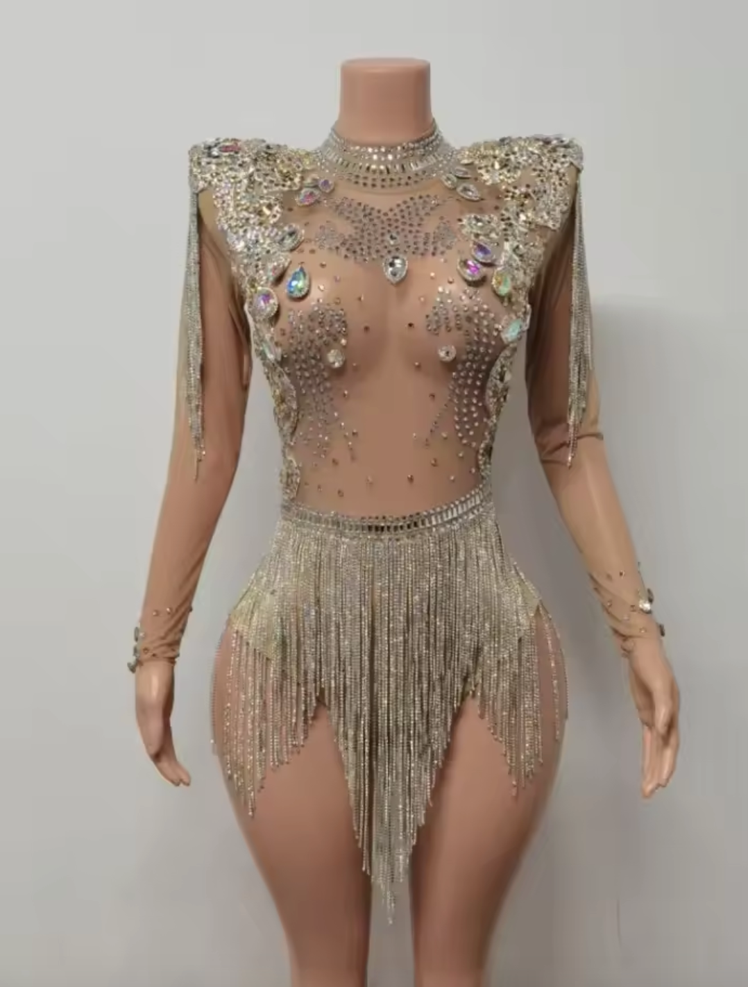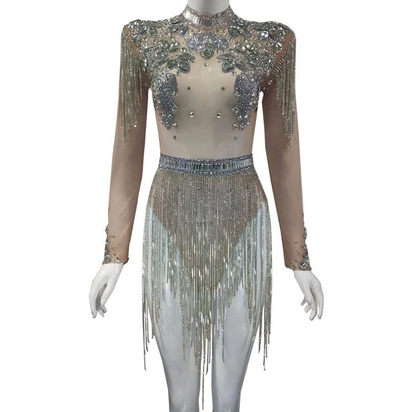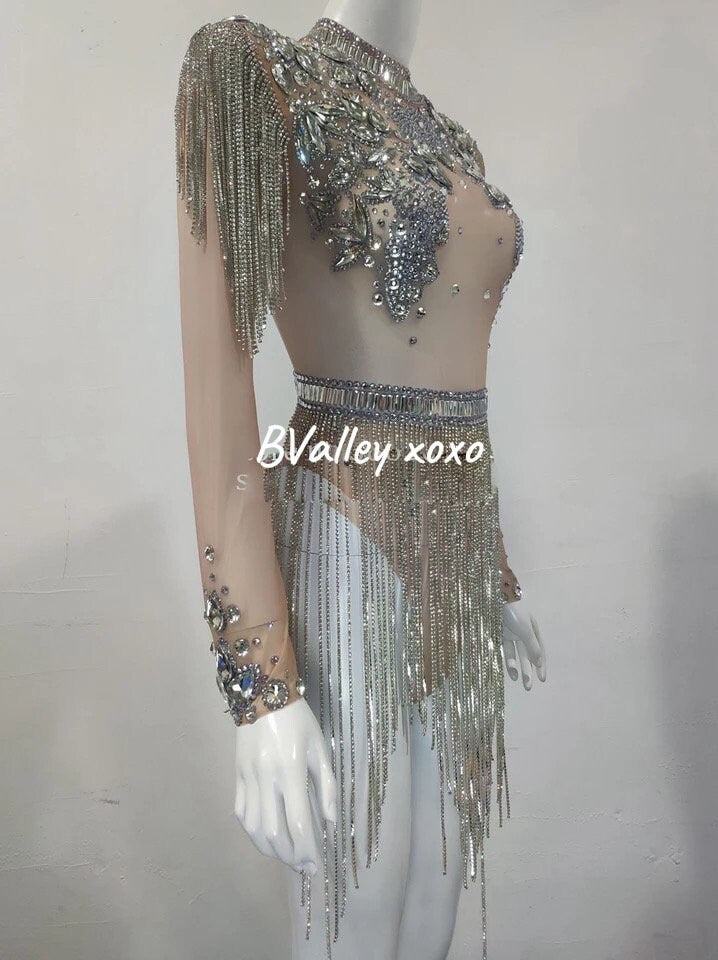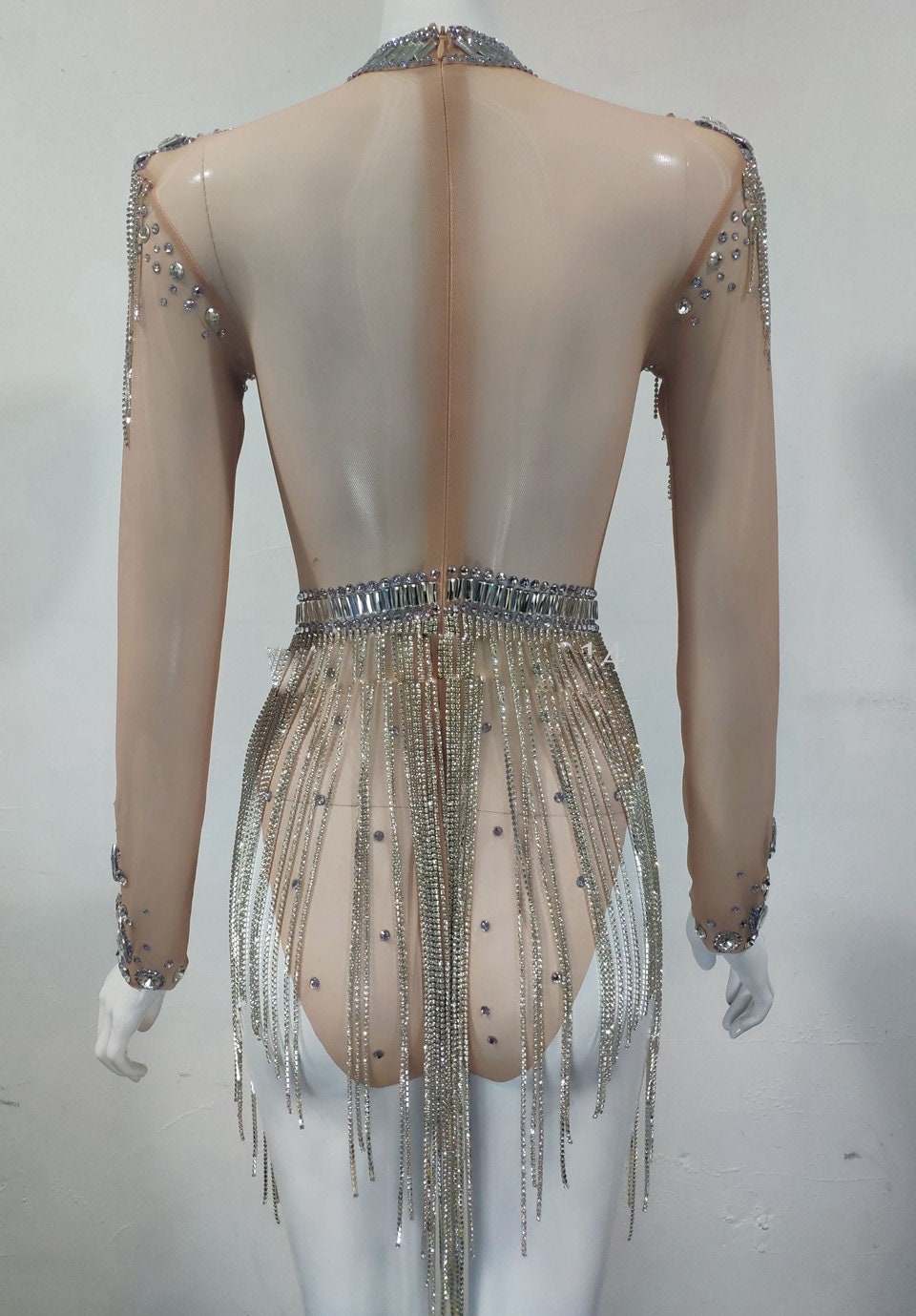 Elegant Fringe Sheer Bodysuit Rhinestone Bodysuit Showgirl Costume Drag Queen Costume