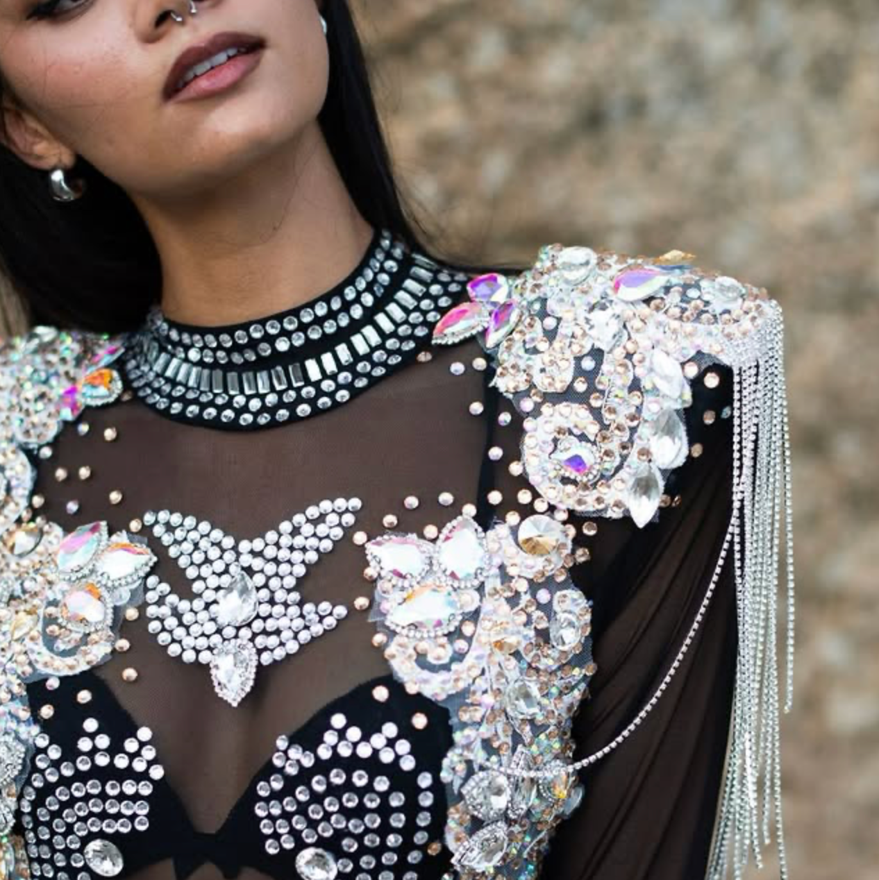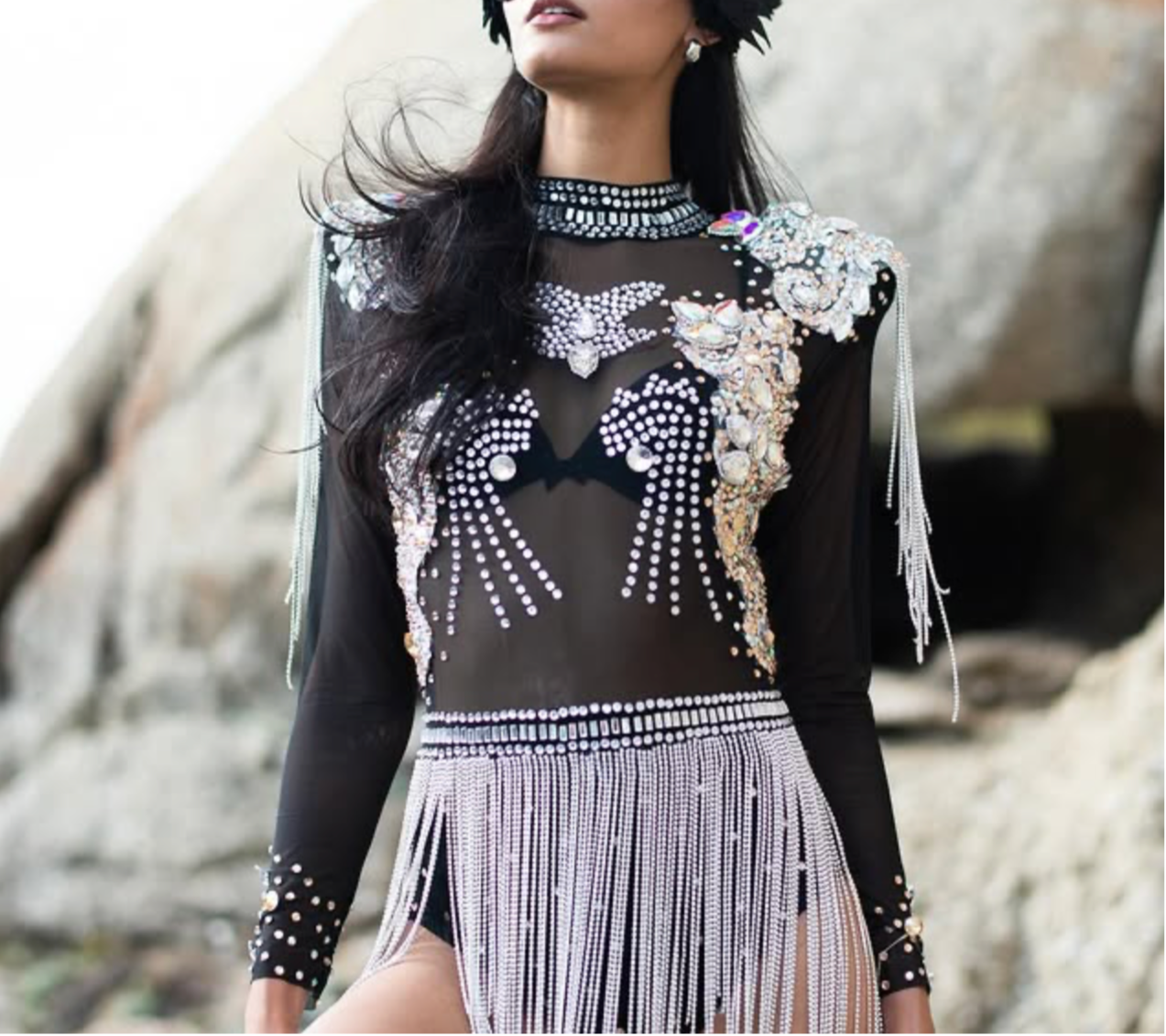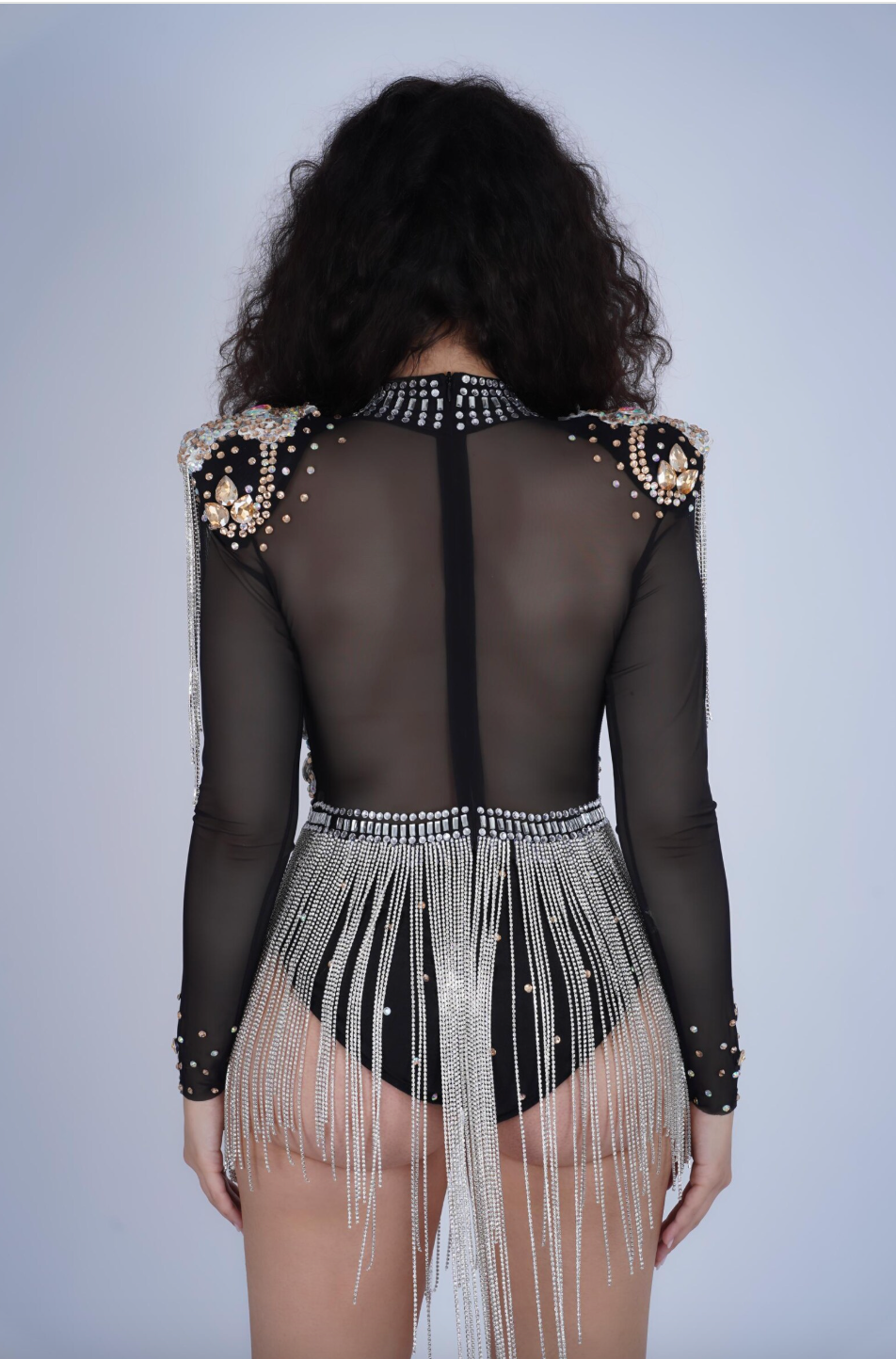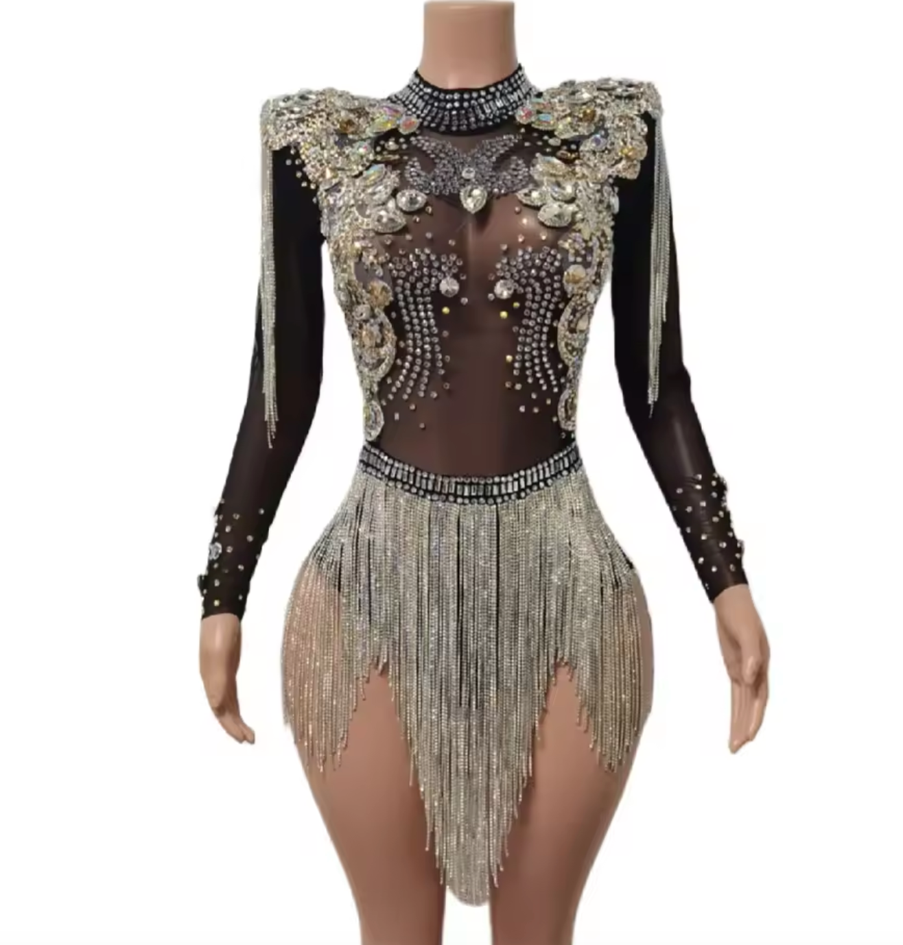 Elegant Fringe Sheer Bodysuit Rhinestone Bodysuit Showgirl Costume Drag Queen Costume