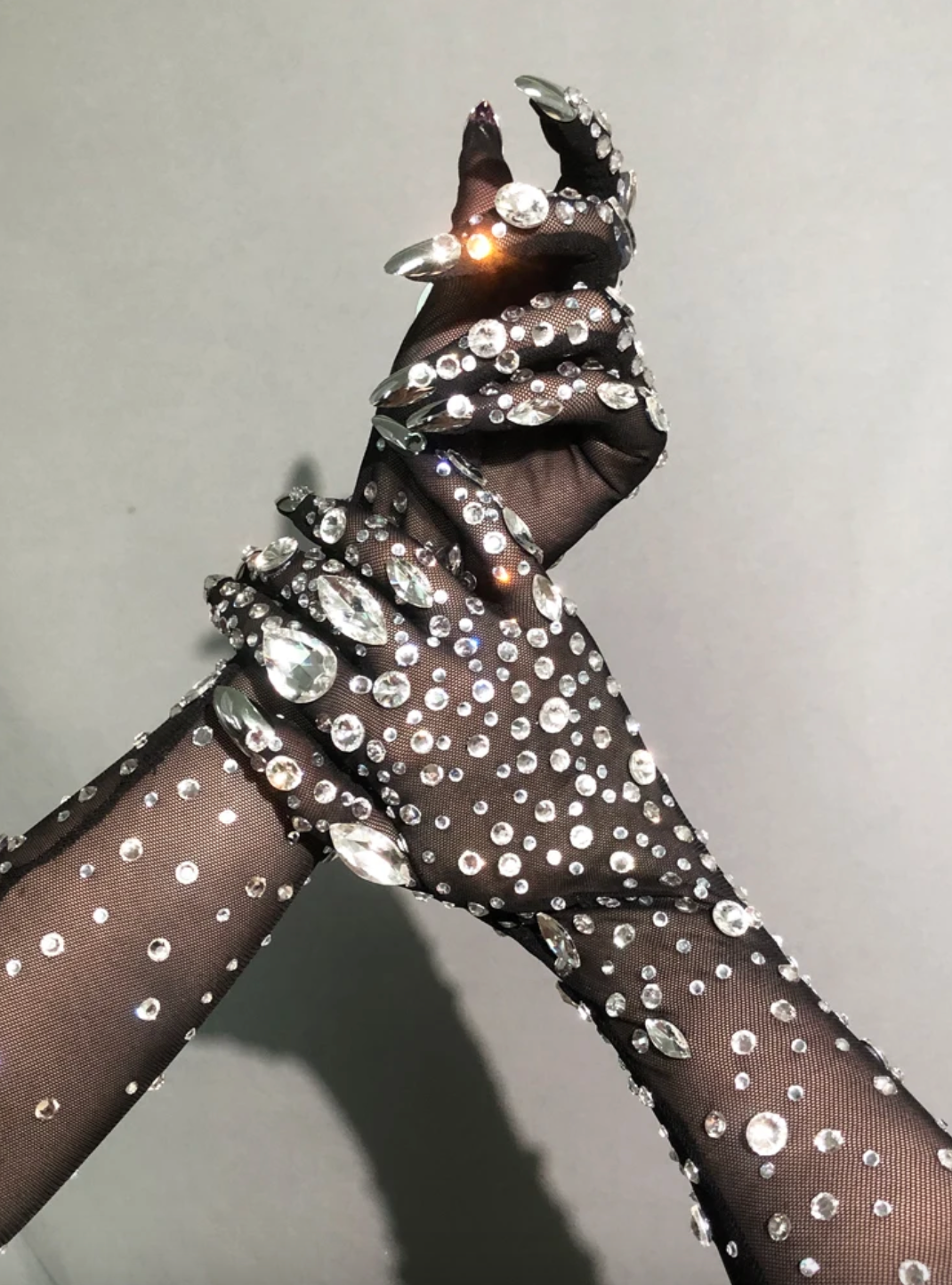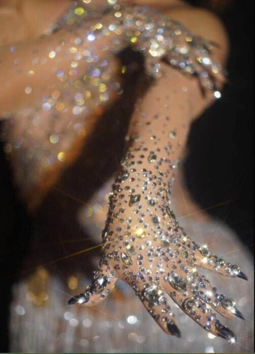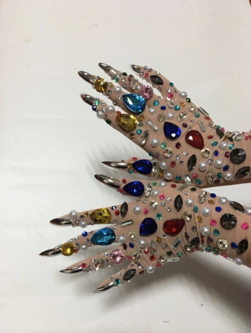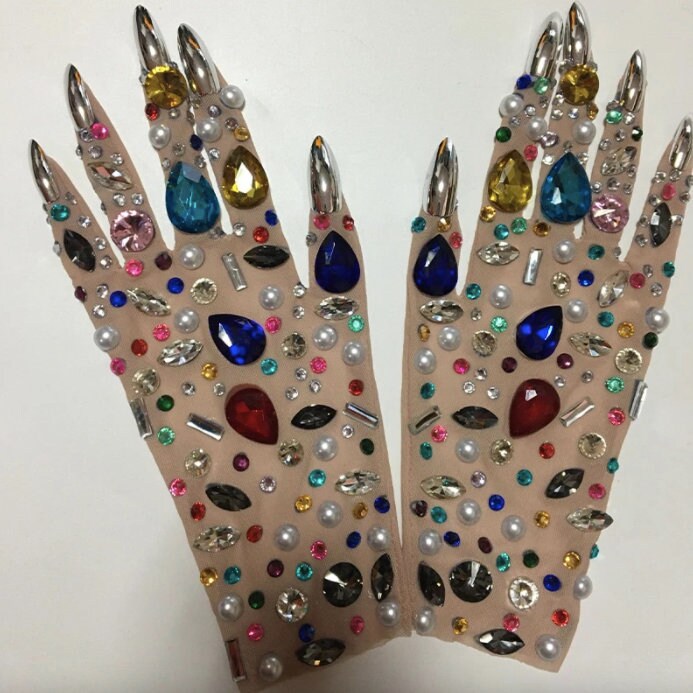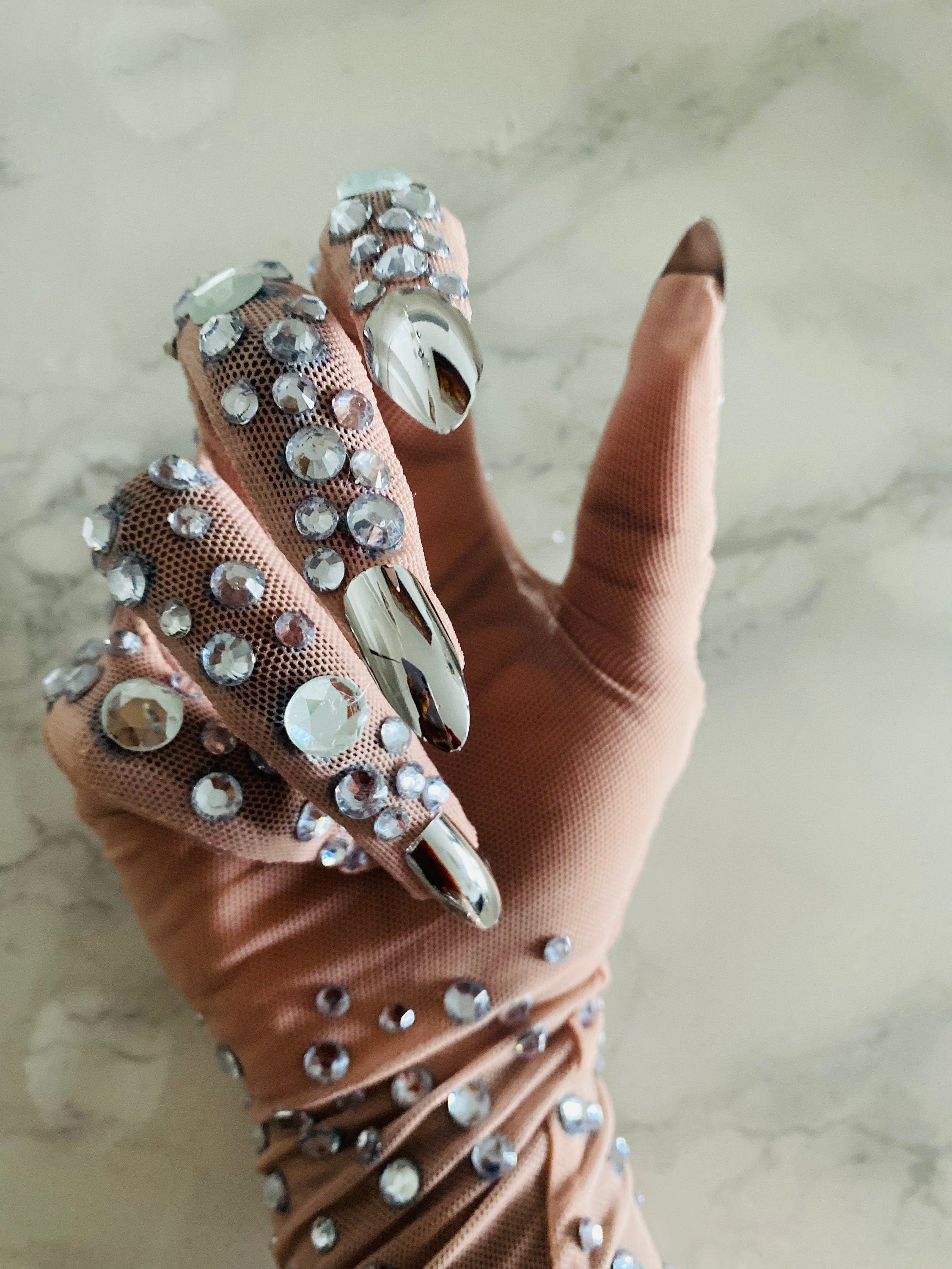 Rhinestone Gloves Vegas costumes shows for events parties" Style: handmade gloves Rhinestone Including False Nails. Rhinestone False Nails Gloves Stiletto Nude Silver Gold Swarovski Costume Rhinestone Costume Vegas Show Girls Wig Sexy Crystal Drag Queen. Silver false nails, stiletto silver long nails. Nails manicure. Rhinestones nails coffin, oval, stiletto. Nail