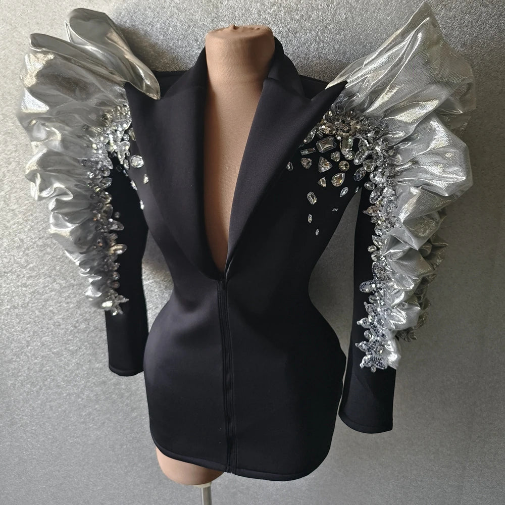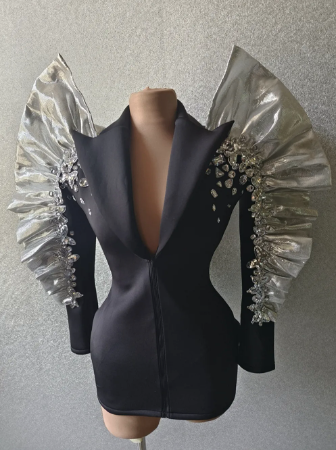Celebrity Party Dress Style & Vegas stage performance costume Black & Silver sleeves short Size: XS, S, M, L Colors: Black/Silver Sexy unique tuxedo dress with rhinestone crystal. Ideal for parties, bride party, birthday, prom. Shop party costume for men and women free international delivery.