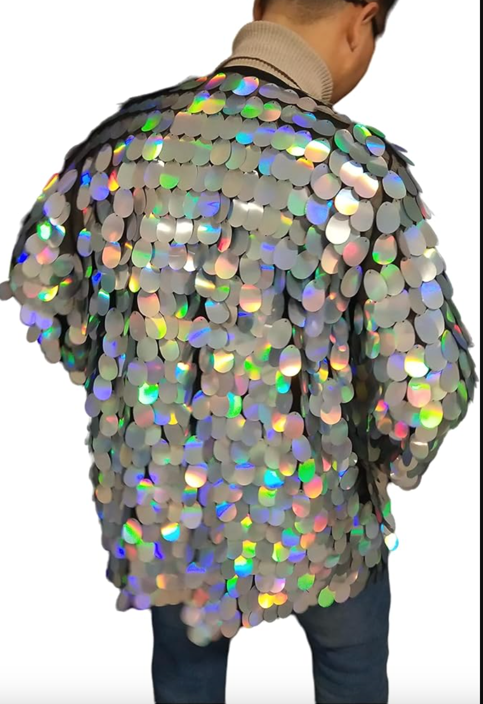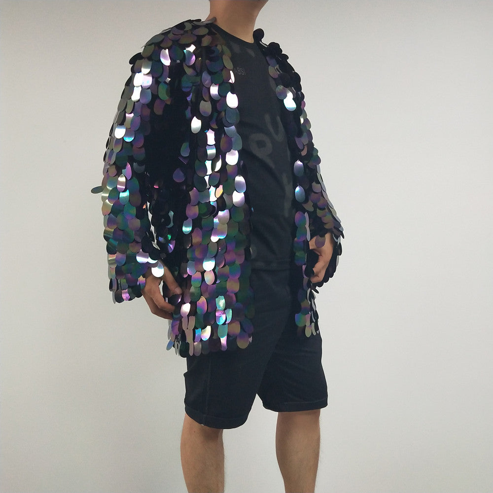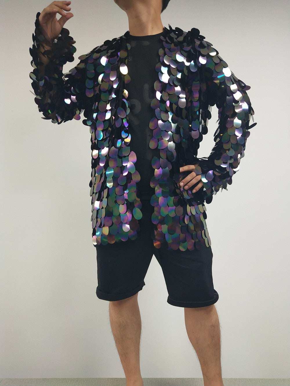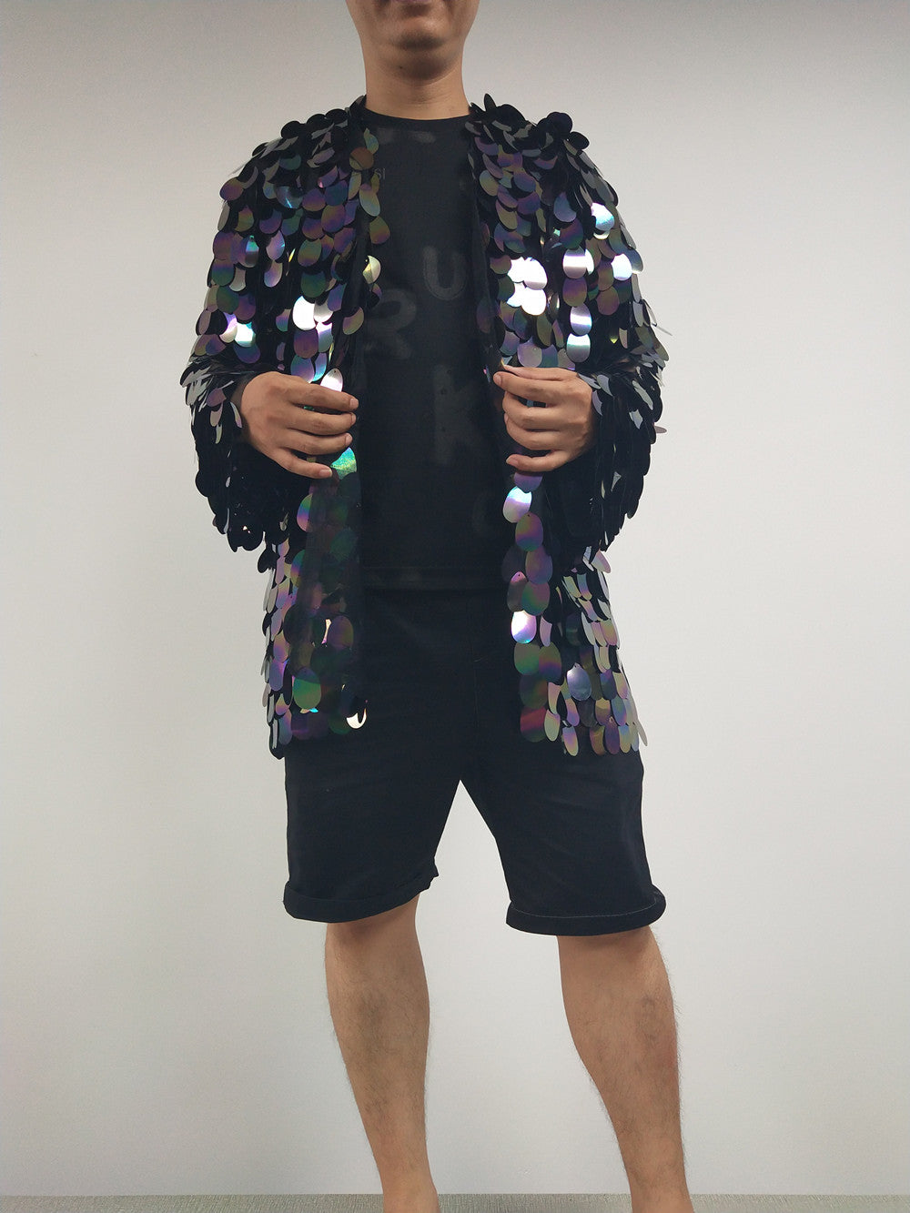 Festival Clothing Men's Kimono Holographic Sequin Jacket Mirror Blazer Disco Costume
